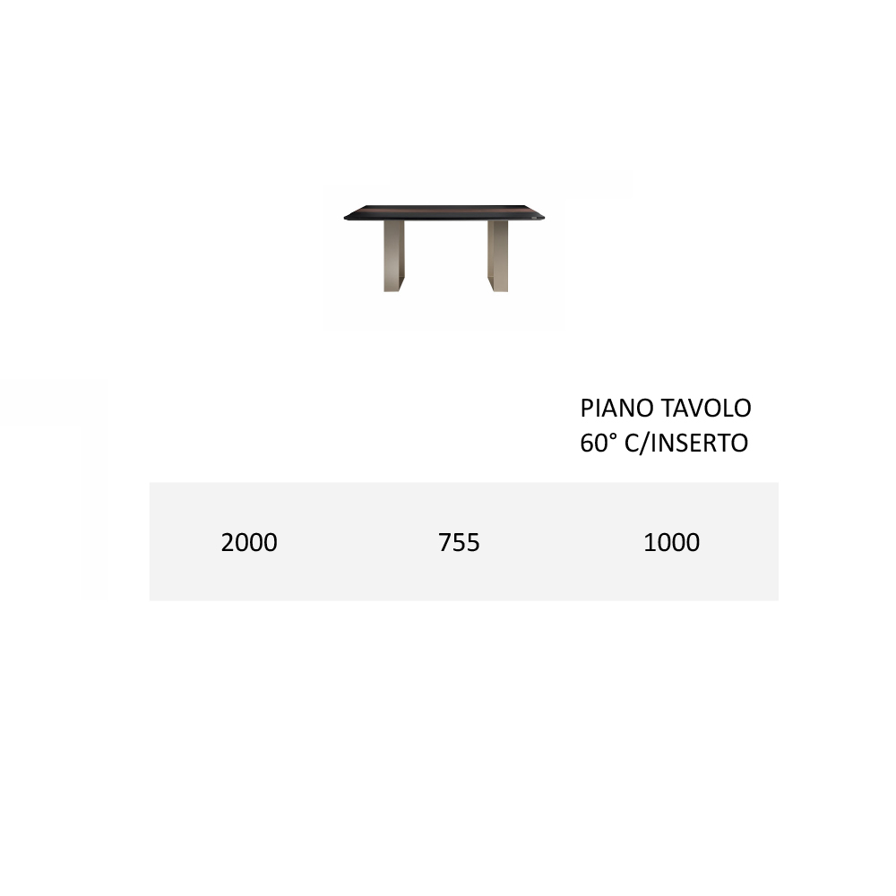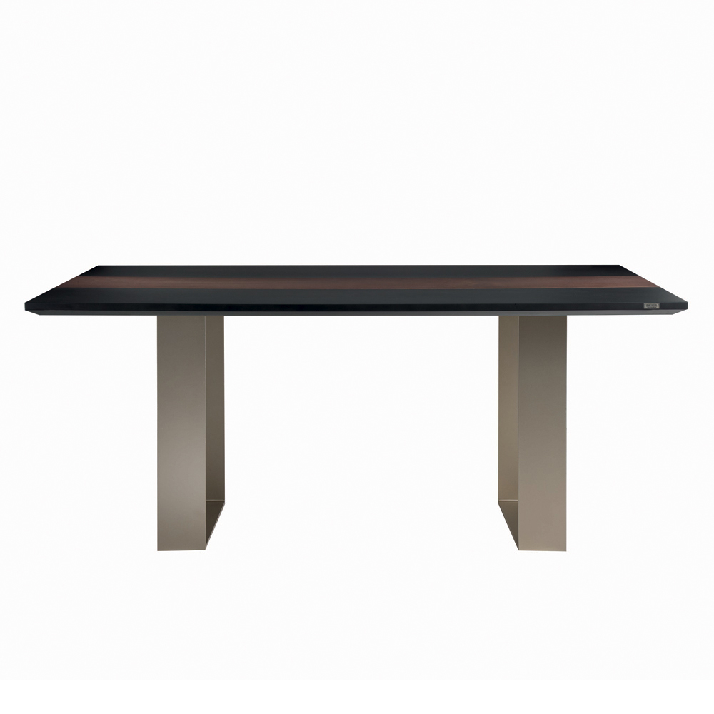 Tavolinë ngrënie e prodhuar në Itali e përbërë nga dy këmbë hekuri me finiturë nikeli dhe pjesa e sipërme drejtkëndore në mdf me finiturë qymyr druri me futje të sipërme prej druri të ngurtë me fije hiri të njollosur. Një plotësues me një stil minimal, por tepër modern, i krijuar për të arreduar çdo hapësirë jetese në mënyrë thelbësore. Estetika e tij është veçanërisht e thjeshtë, e karakterizuar nga forma minimale, një majë drejtkëndëshe e mbështetur në dy këmbë me një mjeshtëri të veçantë që transmeton një efekt vizual dinamik dhe elegant.
