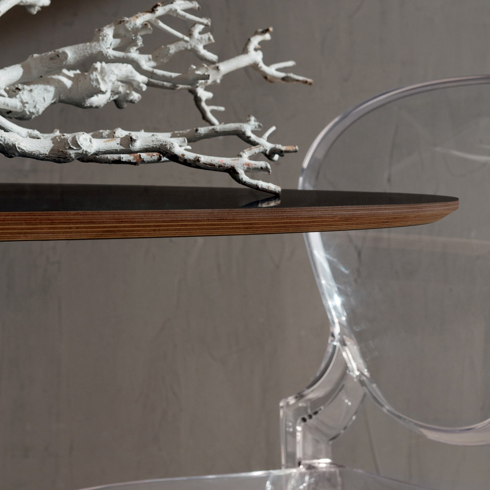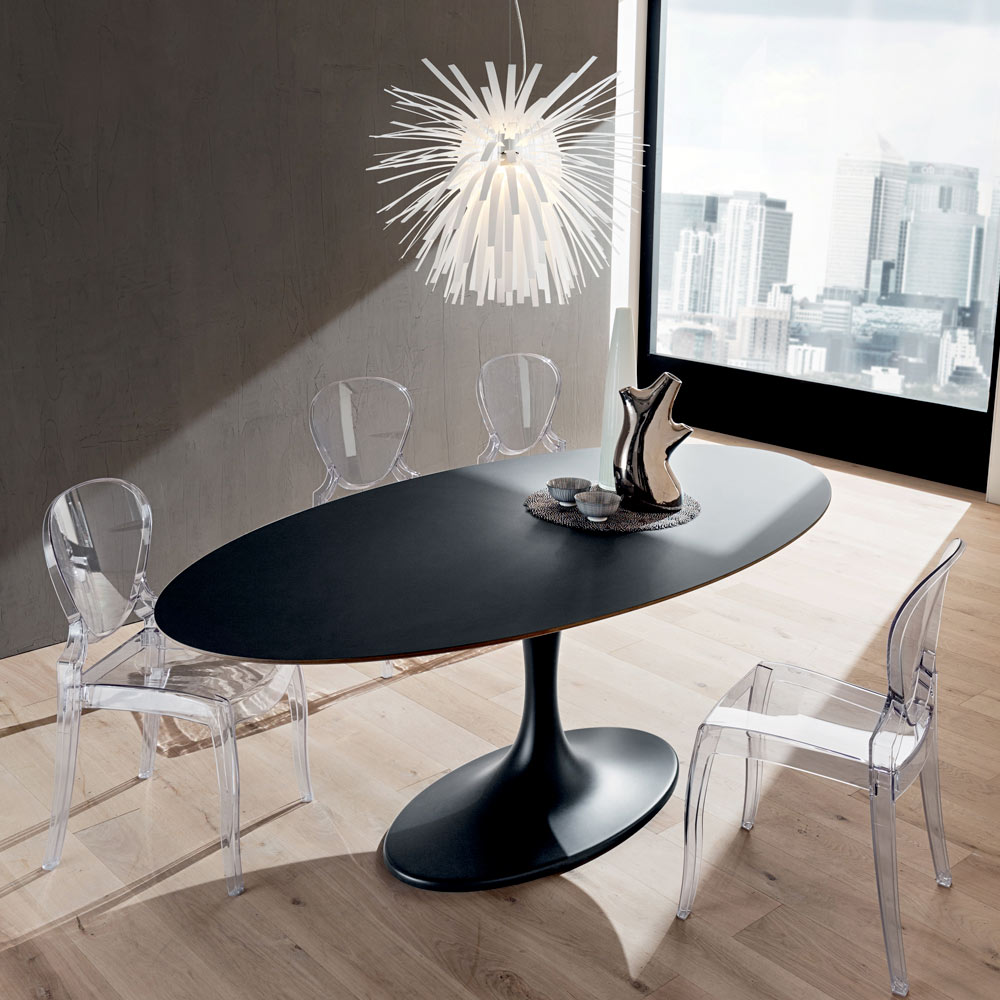 Tavolinë ngrënie e prodhuar në Itali me majë ovale me kompensatë thupër me sipërfaqe të veshur me finiturë të zezë fenix dhe bazë me mermer mineral (mermer sintetik). Një stil jashtëzakonisht origjinal dhe kreativ e karakterizon këtë pjesë të mobiljeve me një shpirt elegant dhe një estetikë thuajse futuriste të aftë për të bërë çdo ambient unik falë personalitetit të saj veçanërisht inovativ . Linjat e pazakonta që kalojnë përgjatë gjithë bazës përzihen në mënyrë të përkryer me formën ovale të pjesës së sipërme, duke krijuar kështu një ndjesi lëvizjeje dhe një harmoni të shkëlqyer formash . Kontrasti i veçantë midis pjesës së sipërme të kompensatës dhe veshjes fenix e pasuron edhe më shumë dizajnin përfundimtar të tryezës, duke e bërë atë veçanërisht të përshtatshme për ata që duan të arredojnë hapësirat e tyre në një mënyrë të sofistikuar dhe tërësisht revolucionare. Materialet e përdorura me cilësi të lartë dhe punimi 100% Made in Italy rrisin cilësinë dhe vlerën e tij, duke na lejuar kështu të ofrojmë një zgjidhje mobilimi sa të bukur dhe elegante aq edhe solide, rezistente dhe funksionale.