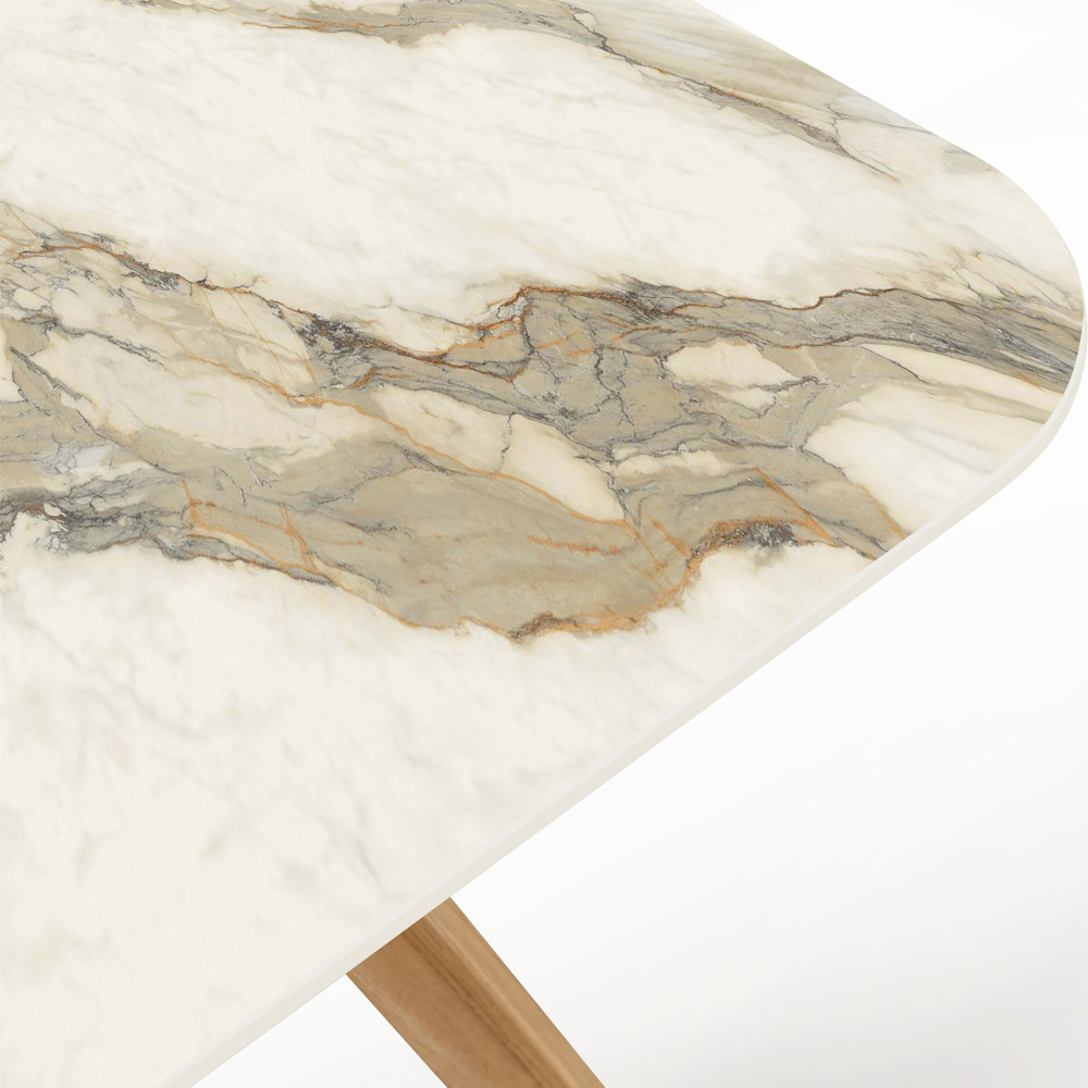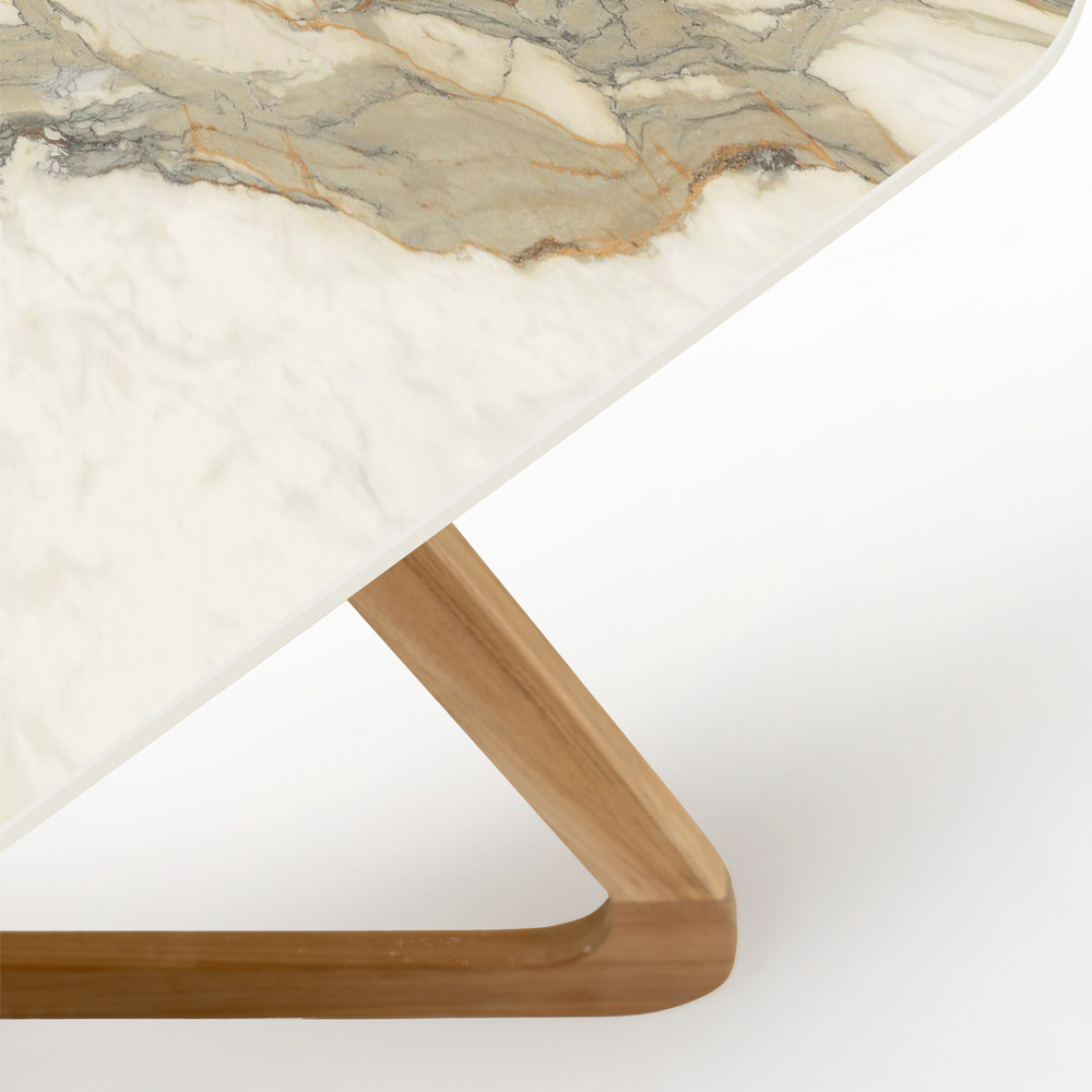 e prodhuar në Itali. Kjo tavolinë për jashtë është një kryevepër dizajni që përzien artin e qeramikës me mjeshtërinë e drurit. Sipërfaqja prej qeramike është frymëzuar nga mermeri prestigjioz Calacatta Hermitage , i njohur për venat e tij të ndërlikuara gri-jeshile në një sfond të bardhë kremoz, duke i shtuar një prekje luksi dhe sofistikimi çdo hapësire të jashtme.