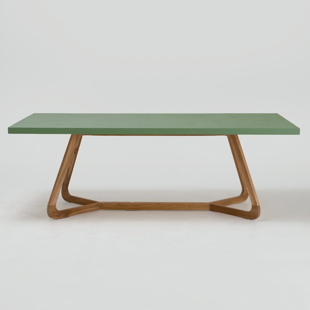 Tavolinë për brenda dhe jashtë prej kompensate deti okumé dhe druri tik. Prodhuar në Itali.