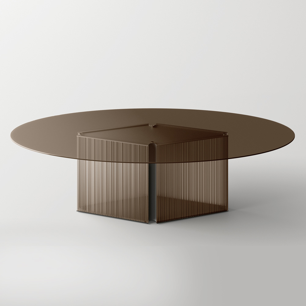 Tërheqja e vërtetë e kësaj tavoline qëndron në bazën e saj unike, me shirita të hollë vertikal xhami që jo vetëm mbështesin pjesën e sipërme, por shtojnë një element teksture dhe lëvizjeje vizuale . Këto linja, me pamjen e tyre pothuajse skulpturore, krijojnë një lojë interesante dritëhijeje, duke e shndërruar tryezën në një skulpturë moderne.