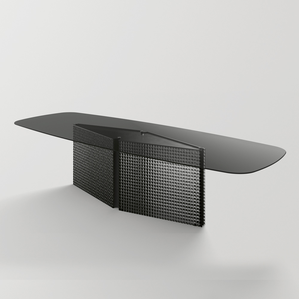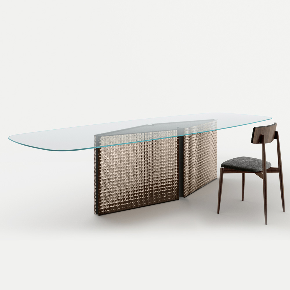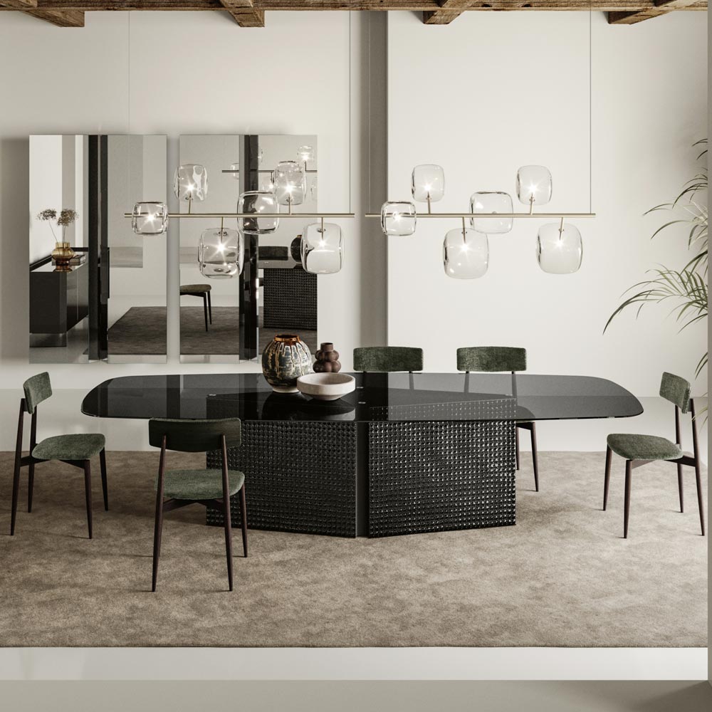 Kjo tavolinë ngrënieje është një shembull i dizajnit avangard që ndërthur elegancën dhe funksionalitetin . Silueta e tij e hollë dhe e zgjatur me një majë xhami ofron një sipërfaqe të lëmuar, të rafinuar, ideale për ngrënien zyrtare ose si një pikë qendrore në një hapësirë dizajni bashkëkohor.