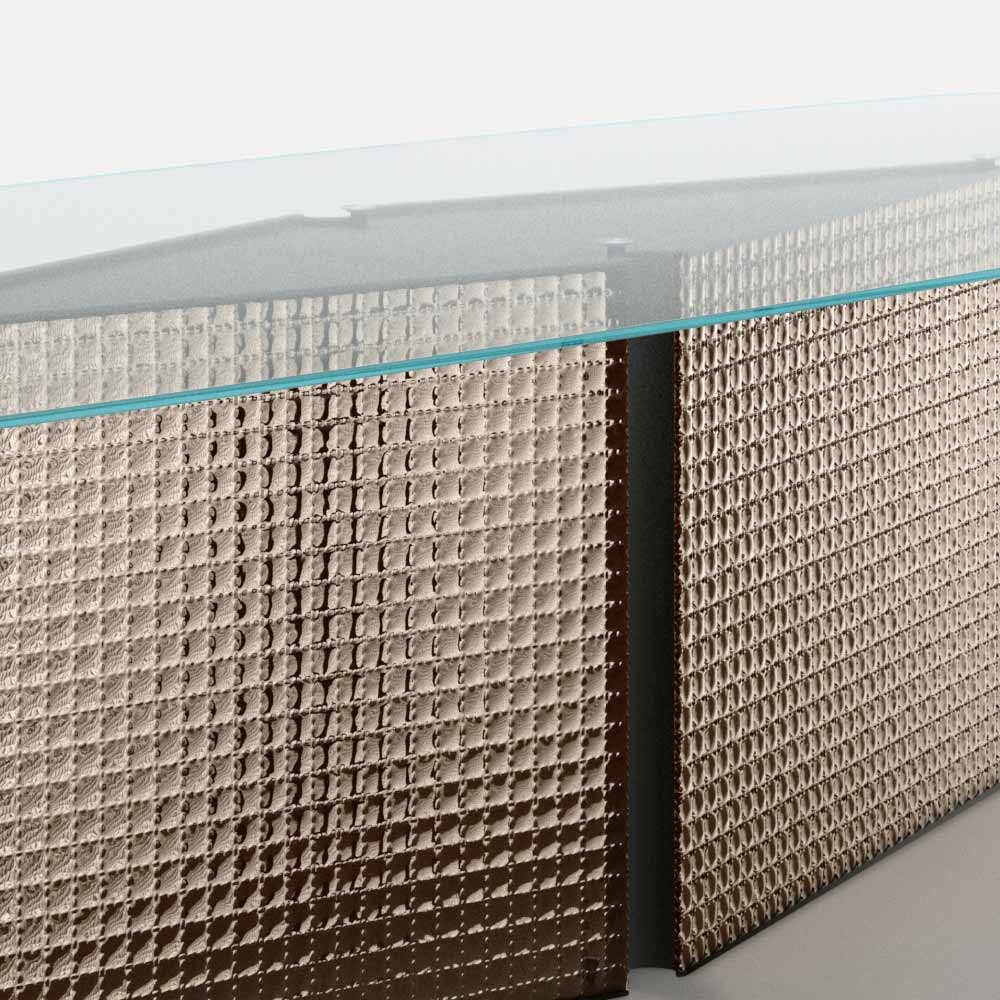 Tavolinë qelqi i shkrirë në formë dhe bazë xhami e shkrirë