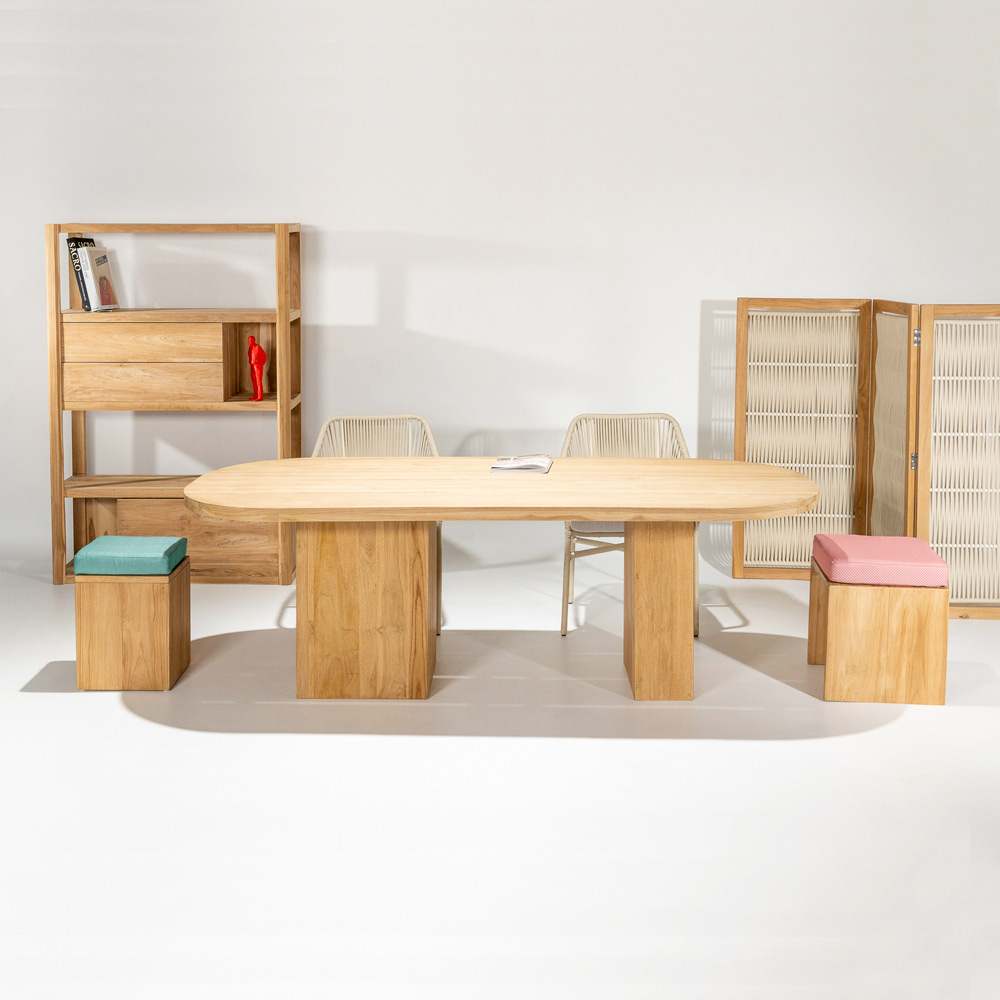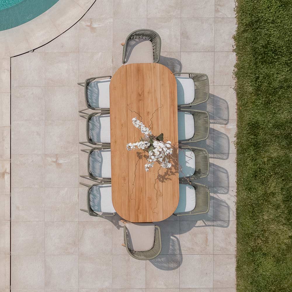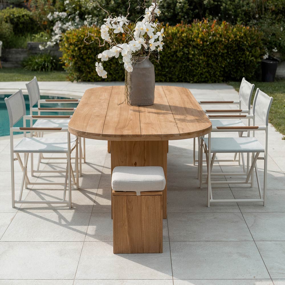 element i thjeshtë por me përmasa harmonike , i përshtatshëm për çdo ambient të jashtëm, siç janë tarracat, verandat, kopshtet ose buzë pishinës, për të krijuar një atmosferë magjepsëse. Druri i tikut i përdorur në ndërtimin e tij garanton