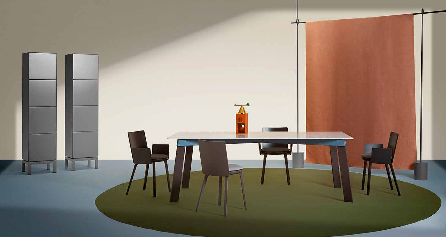 E veçanta e kësaj tavoline të dhomës së ndenjes jepet nga struktura e saj, e bërë si kryqi i Shën Andreas. Origjinale dhe funksionale , dizajni i pirunit të skajeve të çelikut lejon futjen e këmbëve, gjithashtu në çelik, me një sistem montimi të thjeshtë. Një detaj teknik dhe praktik që bëhet edhe estetik: vidhat e nyjeve dhe zgjedhja e ngjyrave të përputhshme apo të kundërta e nxjerrin në pah atë, duke krijuar një stil industrial dhe bashkëkohor . Struktura është prej çeliku të llakuar. Përfundimi : kafe RAL8019 + kryq në blu të hapur RAL5007 + sipër në mermer të bardhë Michelangelo
