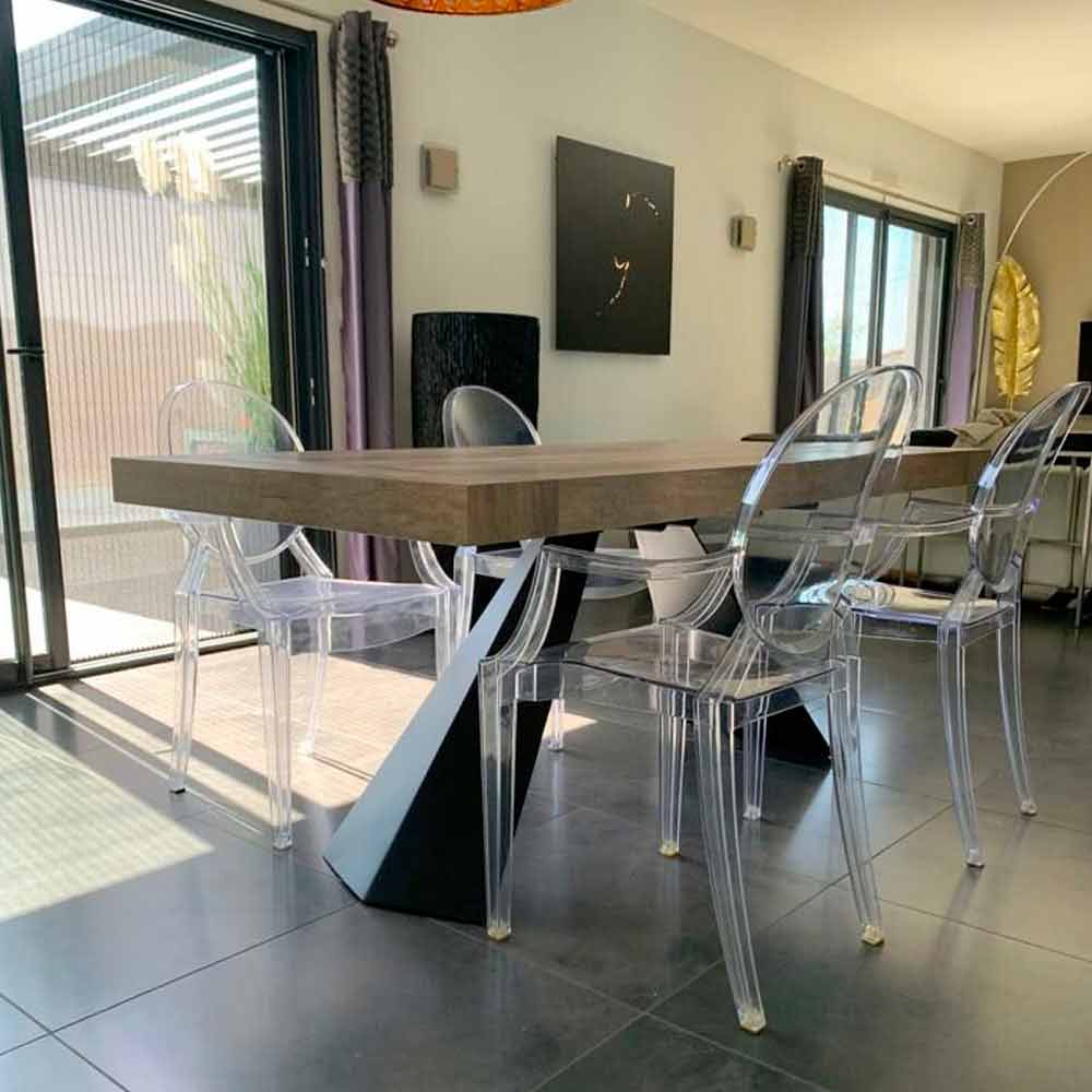 The wooden table top is solid and durable. The shape of the legs allows the comfort of many seats, also beautiful as a piece of furniture.