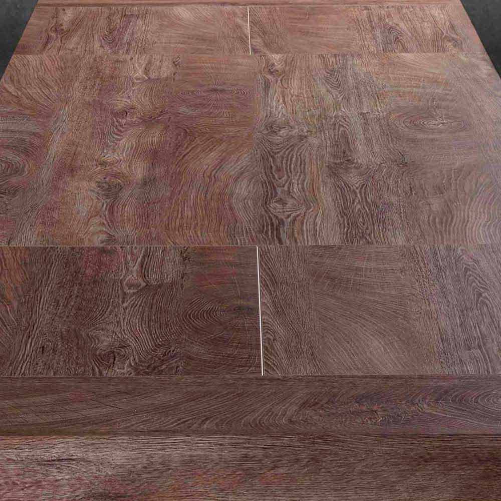 Tavolinë ngrënieje e zgjatur prej druri dhe metali.
