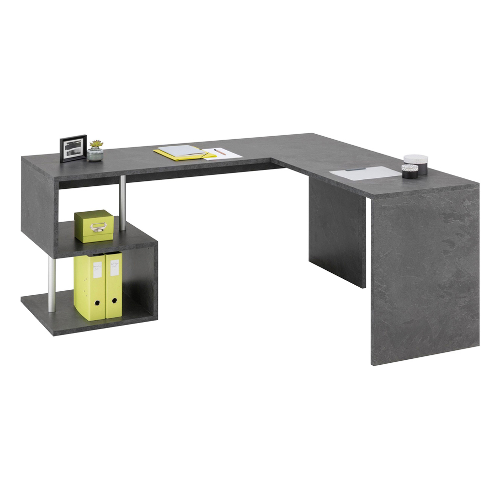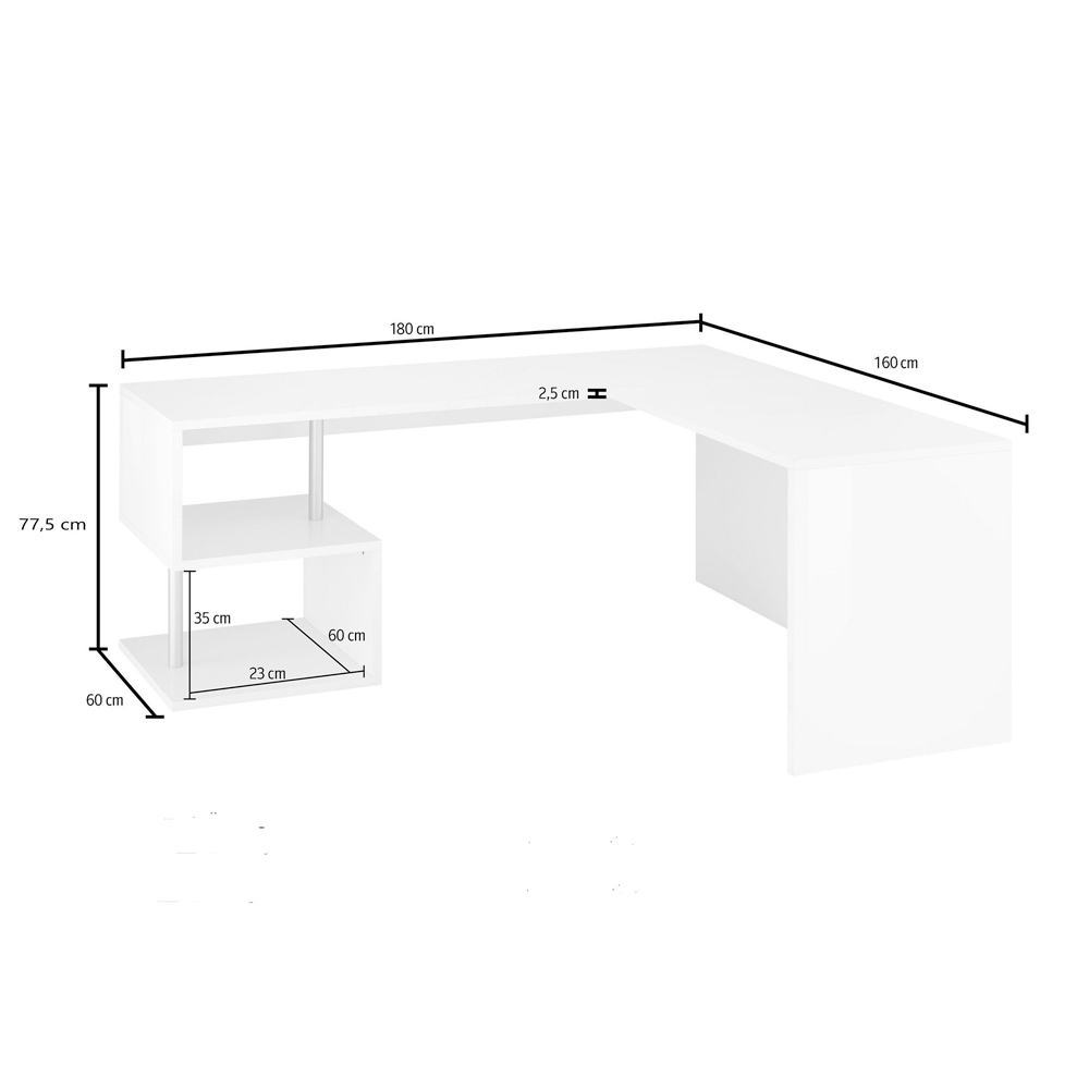 Tavolina e këndit karakterizohet nga dizajni i saj modern me një raft anësor praktik në formën e një "S" me 2 ndarje të hapura që i jep strukturës një pamje të veçantë dhe bashkëkohore. Mund të përdoret si tavolinë studimi ose pune, është prej druri melamine të qëndrueshëm dhe rezistent, i veshur me rrëshirë melamine, i disponueshëm në dy përfundime.