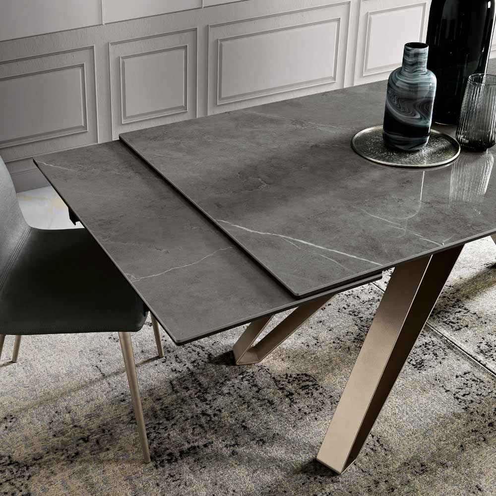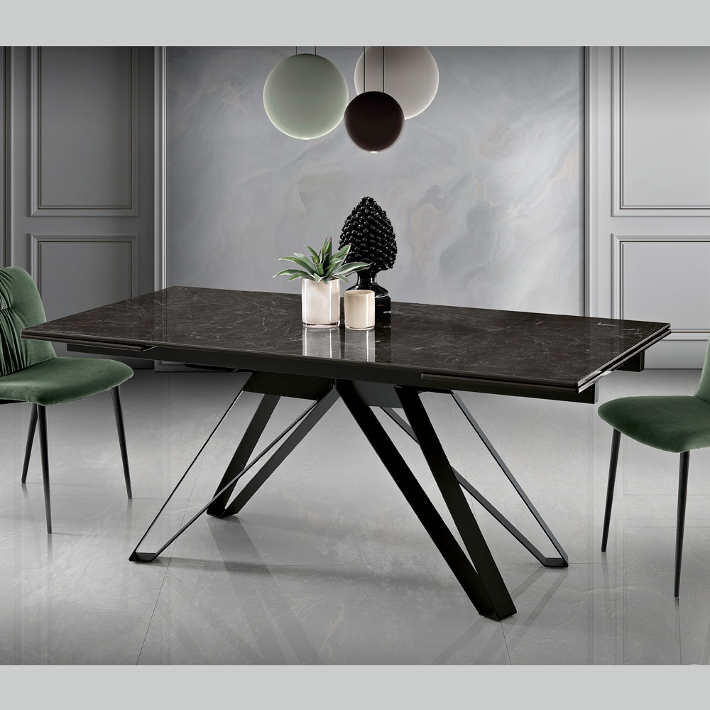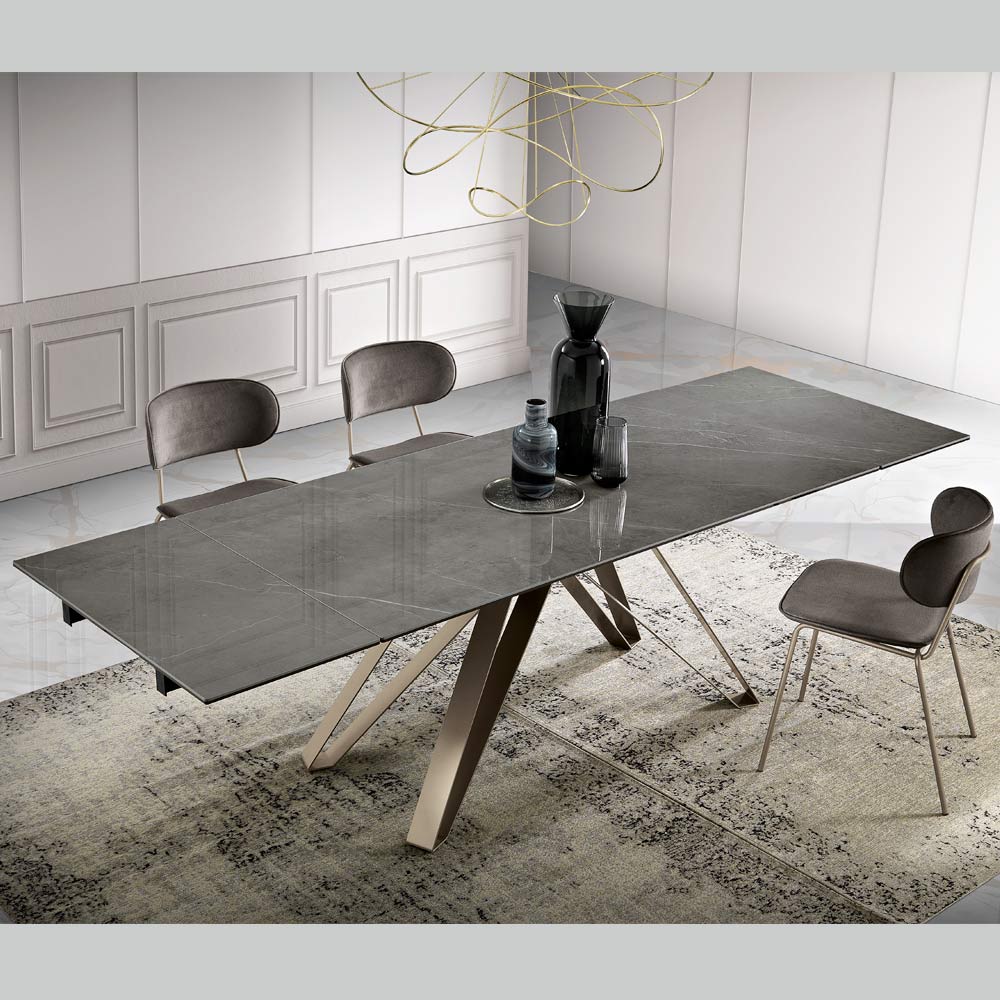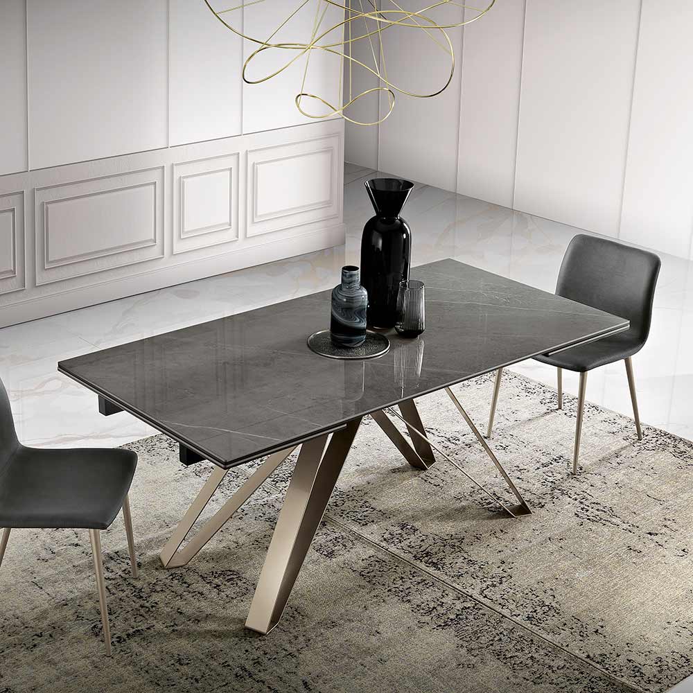 E zhytur në një gamë të sofistikuar ngjyrash, kjo tryezë e zgjatur është shembulli i elegancës bashkëkohore. Pjesa e sipërme prej qelqi-qeramike është një triumf estetik, një kanavacë natyrale mbi të cilën vizatohen venat të cilat i shtojnë thellësi dhe lëvizje sipërfaqes.