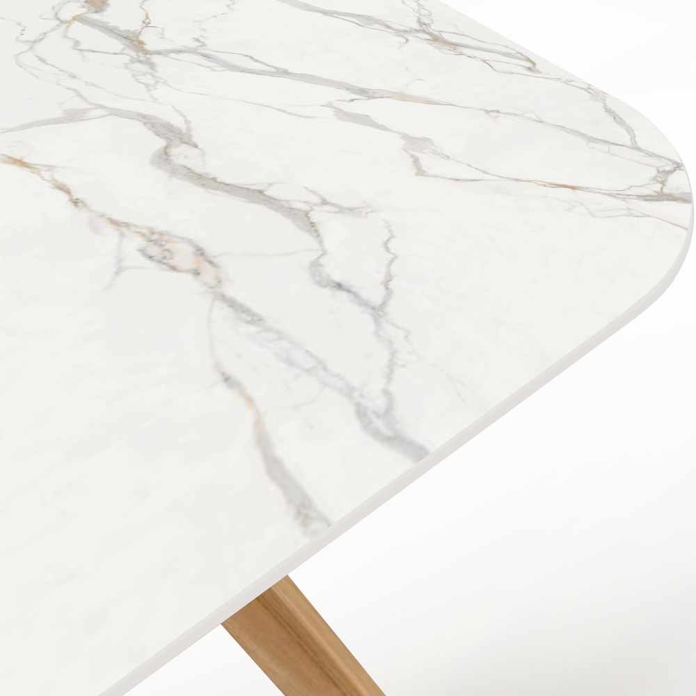 e prodhuar në Itali. Kjo tavolinë për jashtë me një sipërfaqe qeramike Calacatta Oro është një homazh për elegancën e përjetshme dhe luksin delikat. Ajo kombinon një bazë druri të ngrohtë dhe mikpritëse me një sipërfaqe qeramike që imiton në mënyrë të përkryer mermerin Calacatta Oro, i njohur për venat e tij unike të arta në një sfond të bardhë.