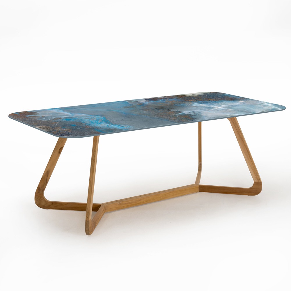e prodhuar në Itali. Kjo tavolinë për jashtë është një bashkim perfekt i elegancës natyrore dhe artit modern. Sipërfaqja e tavolinës, e punuar nga qeramika me cilësi të lartë, paraqet një përfundim unik që imiton teksturat organike dhe ngjyrat e gjalla të një formacioni shkëmbor, me nuanca blu, gri dhe thekse bakri. Kjo sipërfaqe nuk është vetëm tërheqëse për syrin, por edhe jashtëzakonisht e qëndrueshme, ideale për përdorim të përditshëm në natyrë.