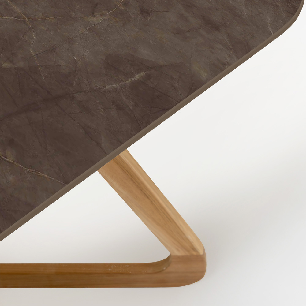 e prodhuar në Itali. Kjo tavolinë për jashtë me një sipërfaqe qeramike në ngjyrë Pulpis Brown është një zgjedhje e sofistikuar dizajni për ata që duan t'i sjellin hapësirës së tyre të jashtme një prekje elegance prej dheu. Tavolina kombinon një bazë druri me një sipërfaqe qeramike që imiton mermerin Pulpis Brown, i njohur për ngjyrën e tij të thellë kafe dhe venat delikate e më të çelëta në sipërfaqe.