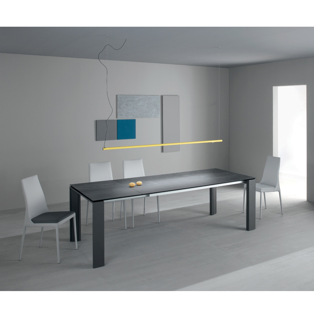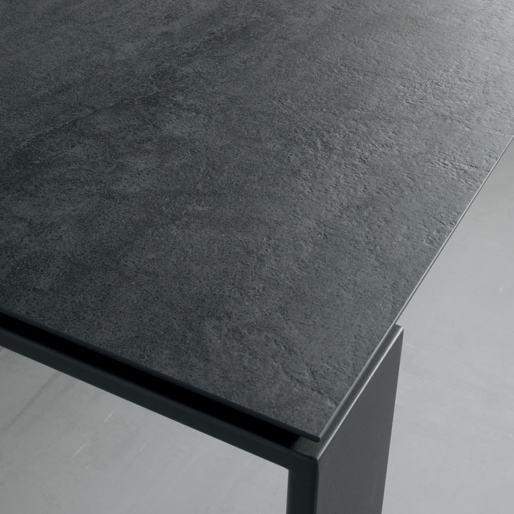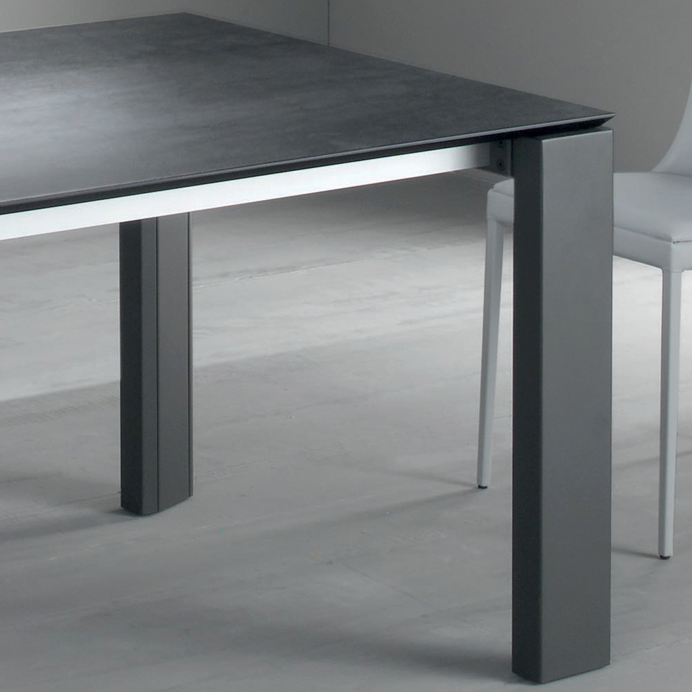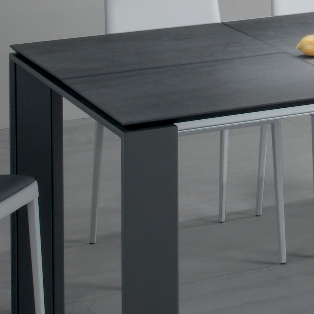 Kjo tavolinë ngrënieje e zgjatur ka një strukturë me këmbë në metal të veshur me pluhur grafit të stampuar dhe një majë mezgjatim të palosshëm të asistuar nga energjia në qeramikë opake në një panel me një kornizë alumini të zgjatur. E veçanta e saj jepet nga struktura me këmbë të holla që mbështesin pjesën e sipërme të hollë të zgjatshme, për një dizajn të lehtë por rezistent me linja të përkulura dhe elegante.