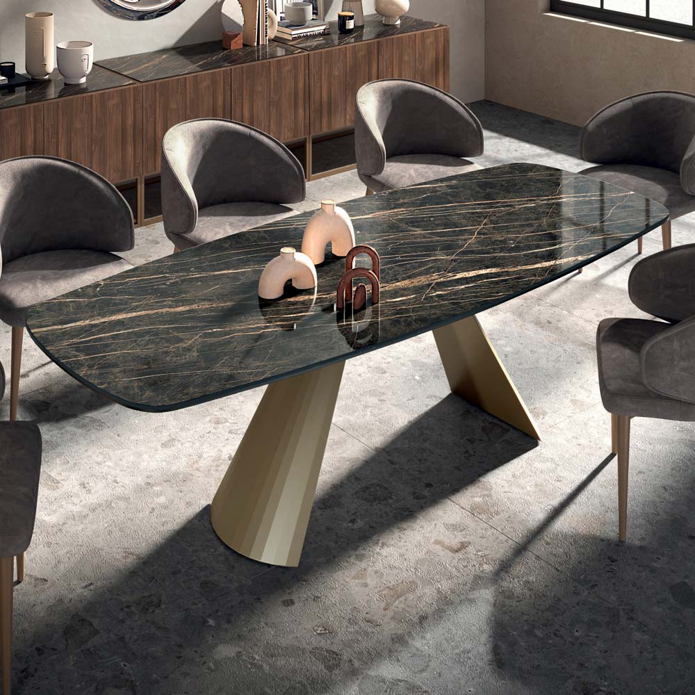 Tavolinë fikse e dhomës së ndenjes në formë fuçie, me majë qeramike , buzë të pjerrëta 45° , bazë çeliku të lakuar me shampanjë dhe këmbë të rregullueshme. Zgjedhja e materialeve me cilësi të lartë dhe vëmendja në krijimin e çdo detaji krijon një produkt me cilësi të shkëlqyer Made in Italy . Falë formës së bazës dhe përfundimeve të disponueshme, kjo tavolinë është protagoniste e çdo ambienti me kontratë të përditshme , duke u bërë një ide perfekte për të gjithë ata që duan t'i japin dhomës një prekje elegante, të kushtueshme dhe unike.