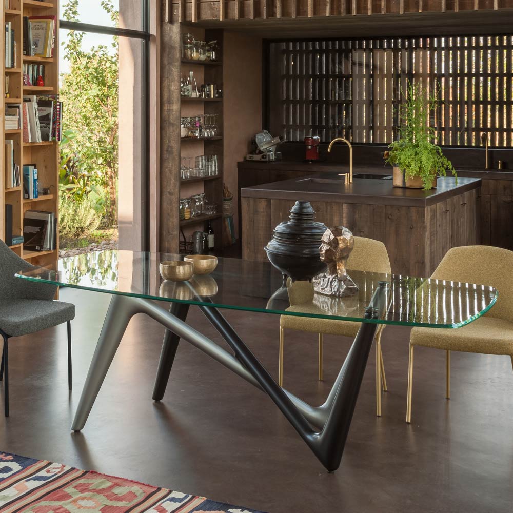 Tavolina e dhomës së ndenjes e bërë me këmbë në poliuretani të ngurtë të lyer gri dhe antracit metalik , sipër në formë fuçie në xhami të kalitur transparent tepër të pastër me buzë të prerë , tërësisht Prodhuar në Itali. Tabela, në një version fiks, është një zgjidhje e gjithanshme për stile të ndryshme arredimi. Me pjesën e sipërme të xhamit të kombinuar me bazën e lyer, ndihmon në përcaktimin e karakterit të shtëpisë. E disponueshme në dy madhësi të ndryshme kryesore për të përmbushur më mirë nevojat e hapësirës. Struktura e tavolinës përfshin këmbët në poliuretani të ngurtë të lyer, dhe pjesa e sipërme në formë fuçi është prej xhami transparente tepër të pastër me një skaj të prerë, duke ofruar një zgjedhje midis një pamje moderne dhe elegante ose një më tradicionale dhe më të fortë.