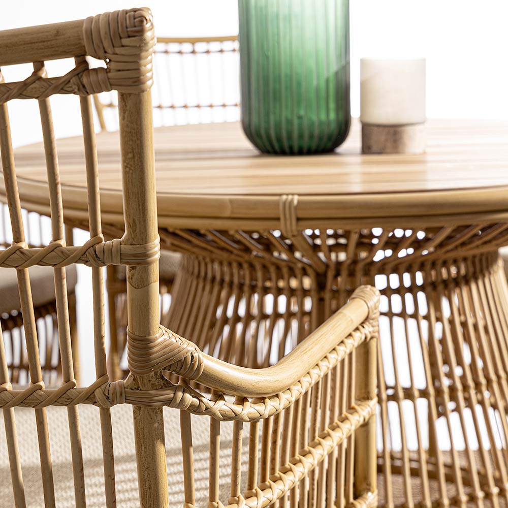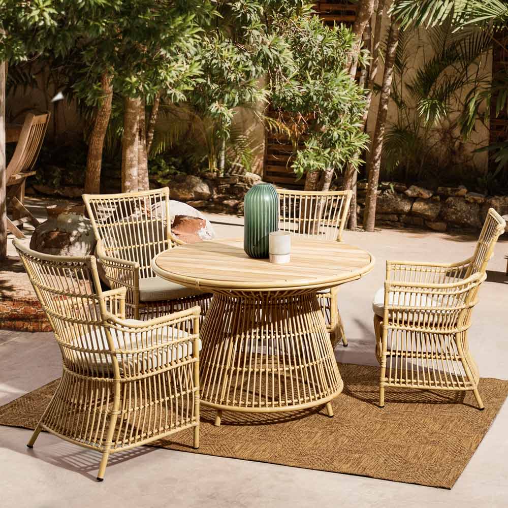 Kjo tavolinë kopshti është një kryevepër e vërtetë e dizajnit dhe funksionalitetit . Me formën e tij organike dhe linjat e pastra, është një element arredimi që shquhet për stilin dhe elegancën e tij , i përsosur për të shtruar dreka dhe darka në natyrë. Pjesa e sipërme e tavolinës është prej druri, duke siguruar qëndrueshmëri të jashtëzakonshme dhe mirëmbajtje të lehtë. Baza e aluminit me efekt bastun prej palme kacavjerrëse krijon një efekt vizual lehtësie dhe hapjeje , duke lejuar që tavolina të integrohet në mënyrë të përsosur me mjedisin përreth, qoftë gjelbërimi i kopshtit apo tarraca e një shtëpie moderne. Jo thjesht një tavolinë, por një pikë takimi , ku dizajni dhe natyra ndërthuren për të krijuar momente të paharrueshme.