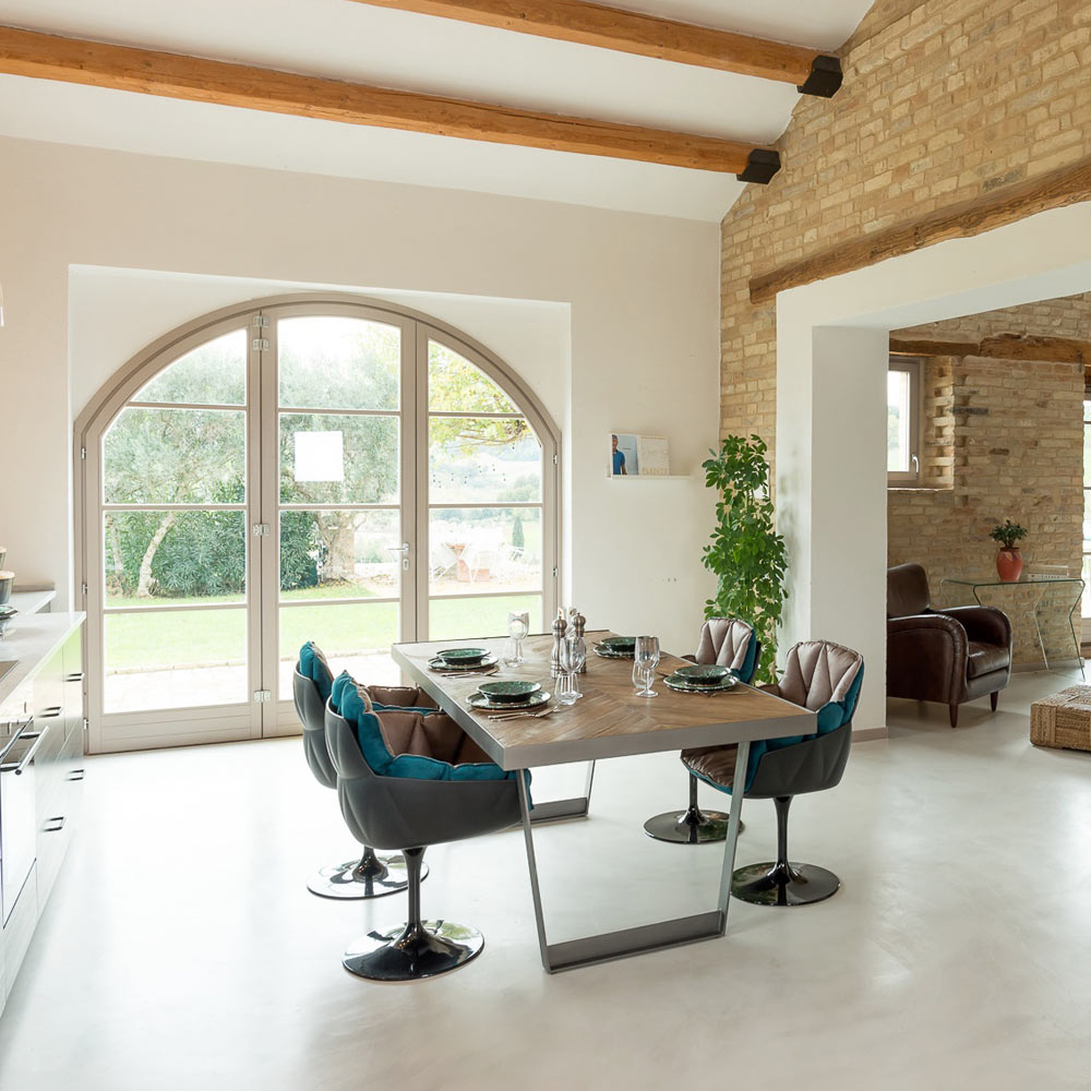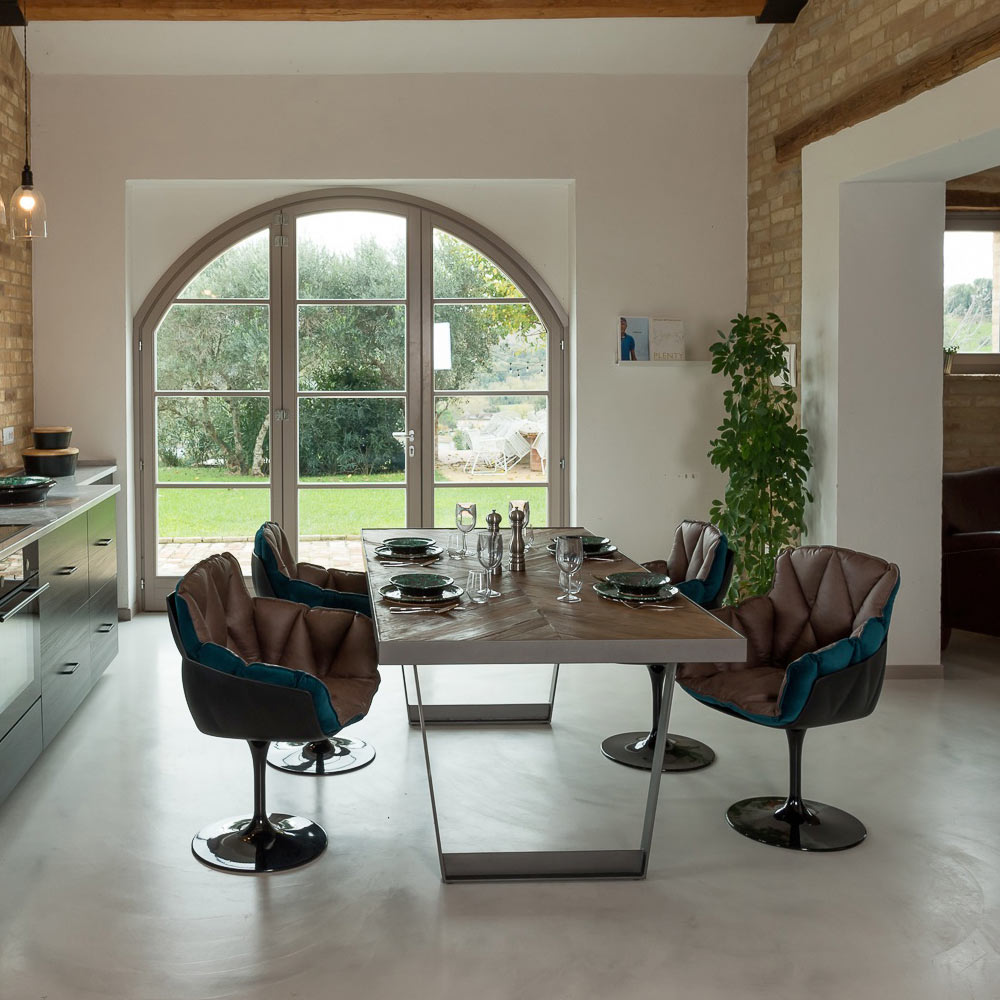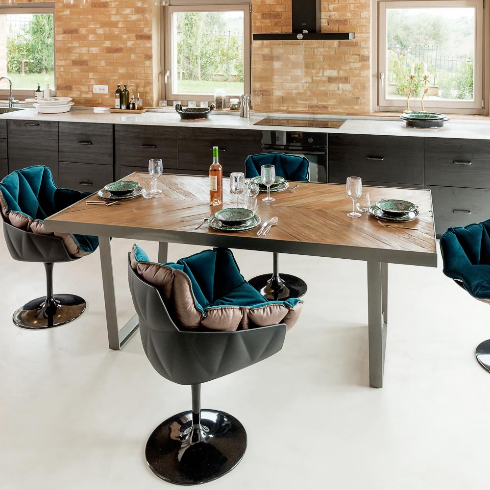 Tavolinë ngrënie e bërë me majë peshku peshku në ngjyrë kafeje natyrale prej druri të ricikluar, kornizë metalike dhe strukturë . Ky grup mobilimi është fjalë për fjalë unik pikërisht sepse mishëron historinë e veçantë të materies së jetuar. Përpunimi bëhet në pjesën më të madhe sipas procedurave artizanale . Çdo gërvishtje dhe papërsosmëri, çdo mbresë në dru, dëshmon origjinalitetin e një të shkuare që merr jetë të re. Druri tropikal i ricikluar ligjërisht nga objektet e vjetra, varkat dhe ndërtesat e braktisura trajtohet dhe pastrohet me mjeshtëri për të rifituar dinjitetin dhe shkëlqimin. Ky produkt kombinon thelbin e shijes rustike me format e dizajnit bashkëkohor dhe me disa detaje të stilit industrial .