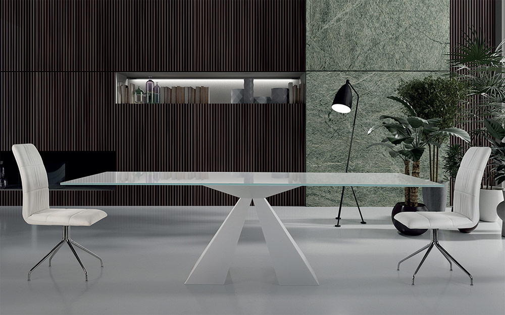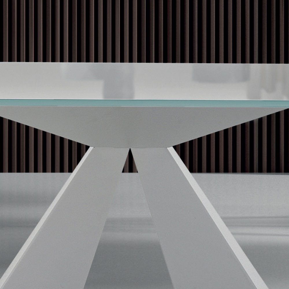 Tavolinë moderne drejtkëndëshe e punuar me dorë në Itali me xham të temperuar dhe bazë çeliku të bardhë.