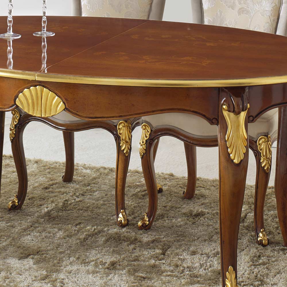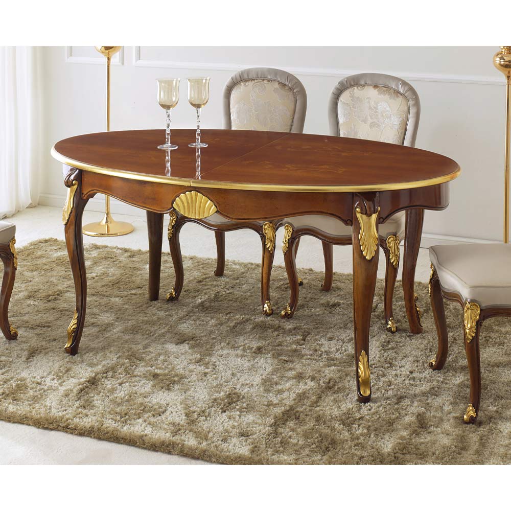 Tavolinë ngrënieje ovale me pjesën e sipërme të zgjatshme falë dy shtesave të brendshme 50 cm, e bërë tërësisht prej druri dhe e disponueshme në arrë Bassano dhe ari antike ose mbaresa druri të bardhë dhe ari. Një komplement unik dhe i rafinuar, i bërë tërësisht në Itali nga mjeshtra të aftë , mjeshtër të artit që përfundojnë çdo komplement me mençuri dhe shije për elegancë. Prodhimi kryhet duke përdorur materiale të shkëlqyera , dhe duke kryer punënmedorë me kujdesin dhe profesionalizmin maksimal që i dallon produktet Made in Italy .