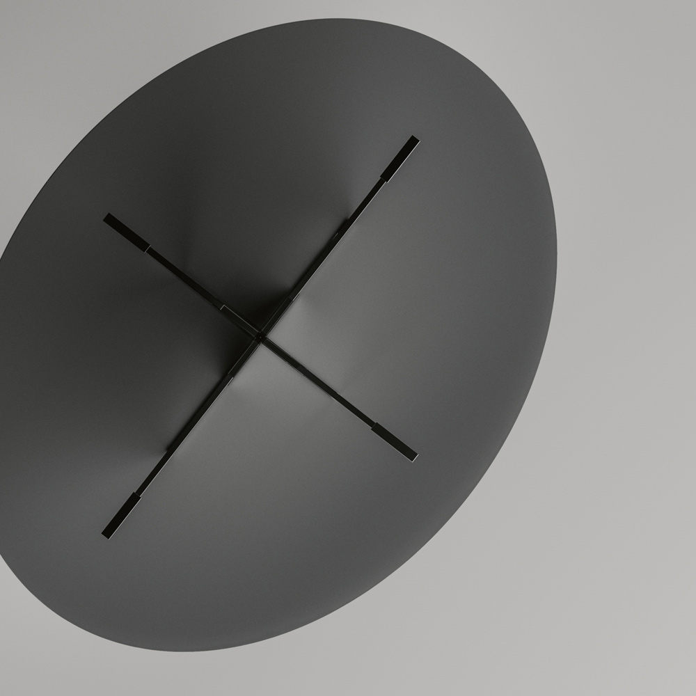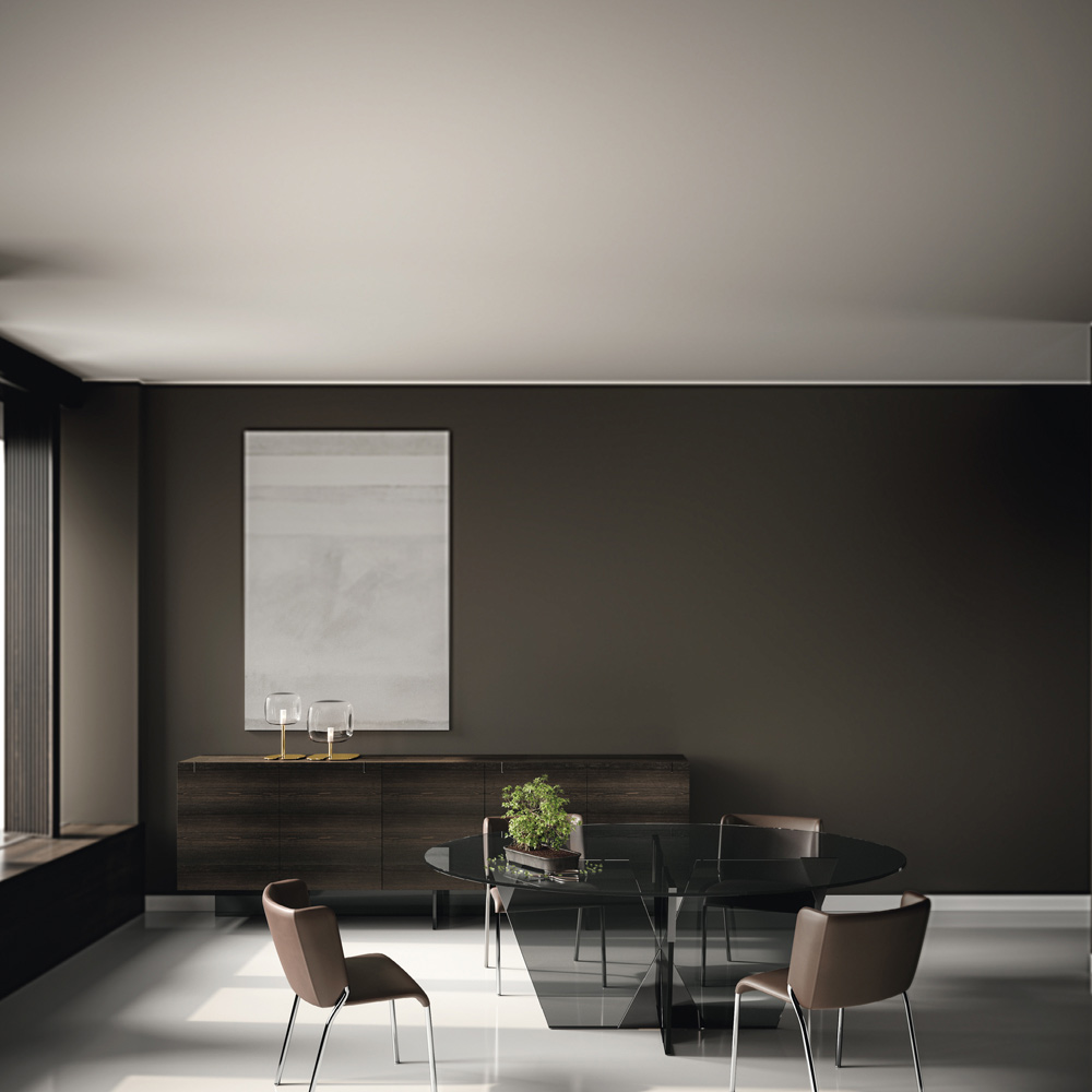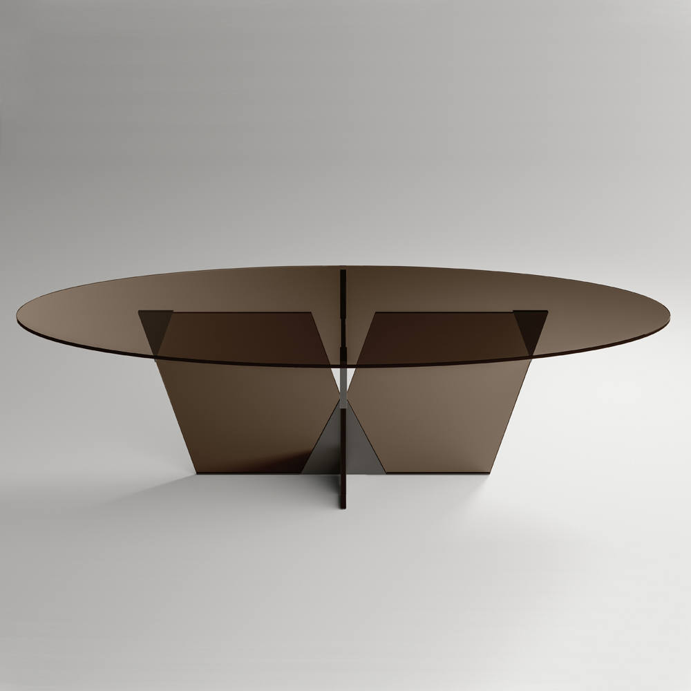 Tavolinë ngrënie e prodhuar në Itali me majë ovale dhe bazë xhami. Pika e fortë e estetikës së tij është baza arkitekturore e karakterizuar nga një bashkim piramidal prej metali që përbën pjesën thelbësore të produktit. Elementet metalike kompletojnë dizajnin e tavolinës duke i dhënë formë xhamit të bazës dhe duke e pasuruar me personalitet dhe origjinalitet.