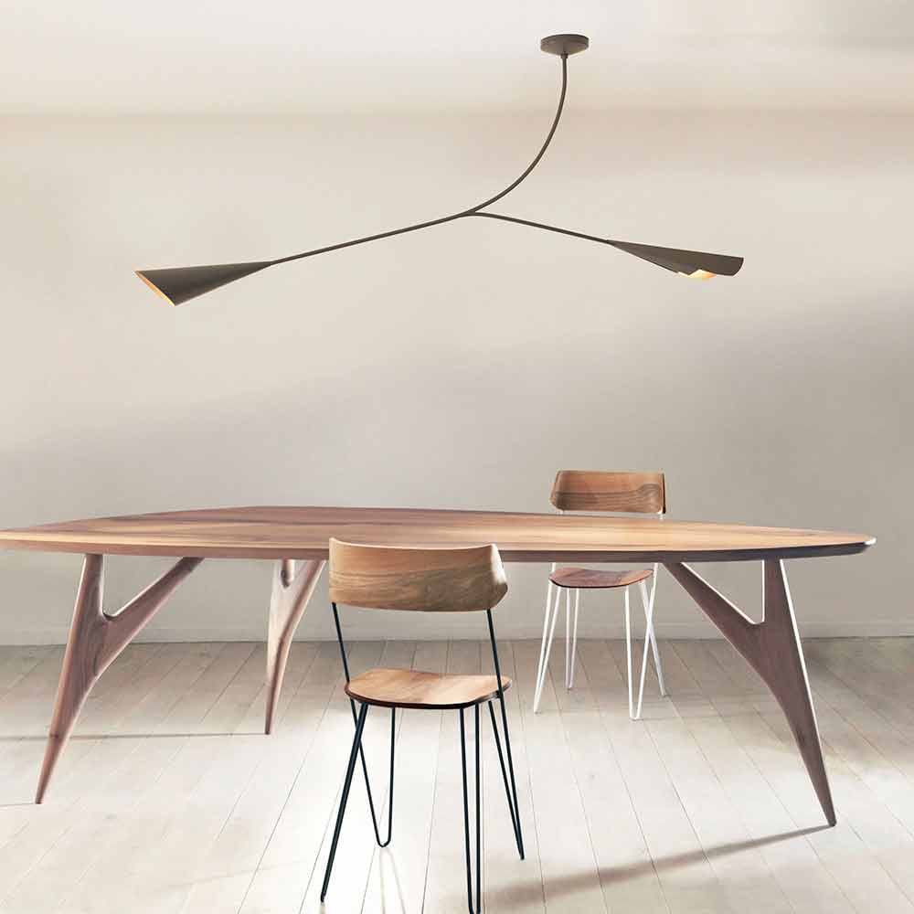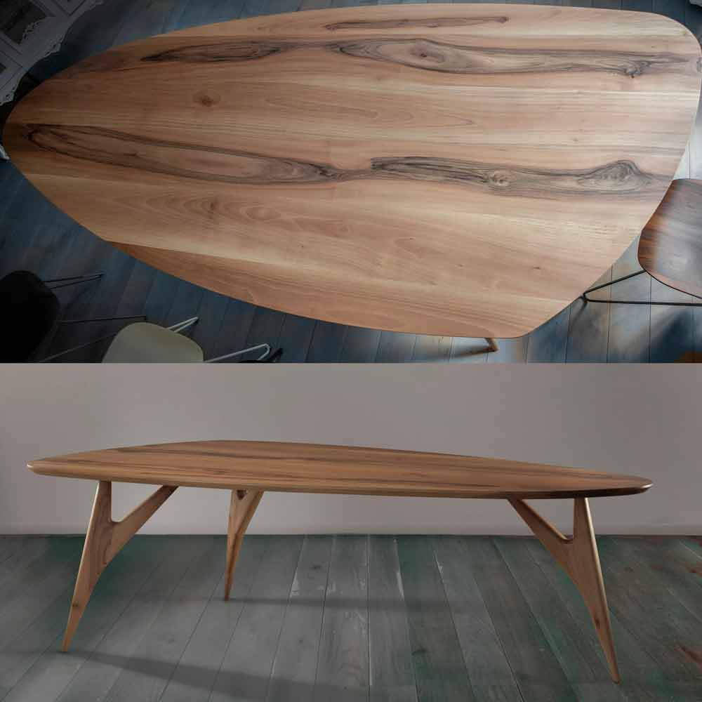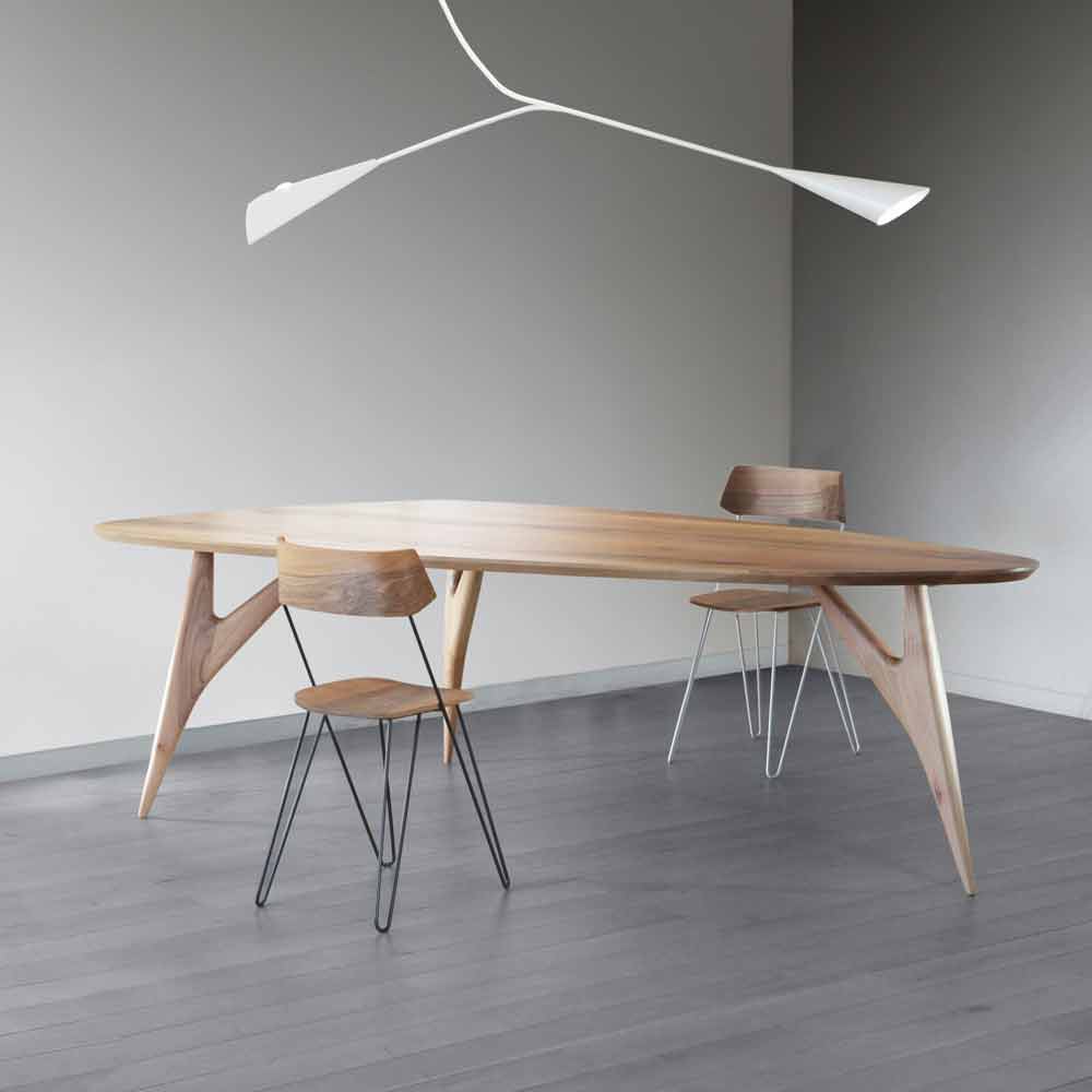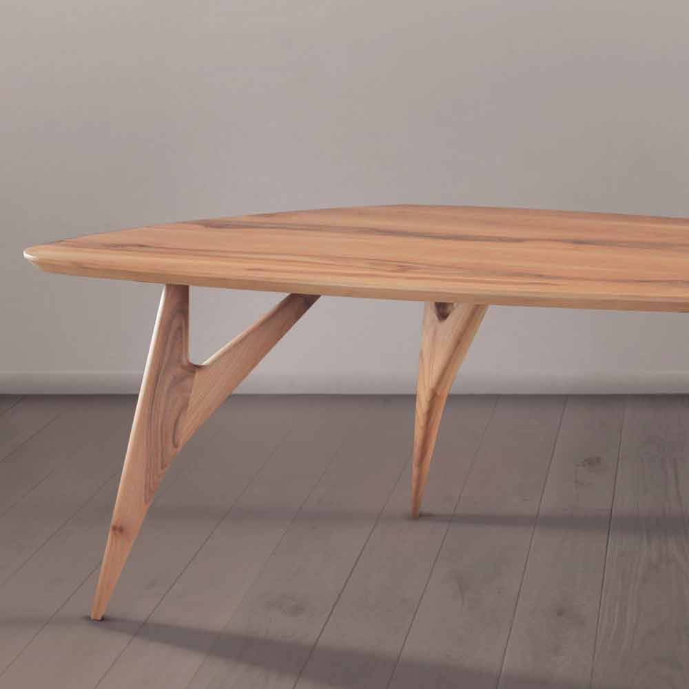 Përmes formës së veçantë të tre këmbëve të saj dhe dyzimit të tyre origjinal, kjo tryezë transmeton një ndjesi lehtësie dhe, së bashku me formën e butë të velave të majës, krijon një atmosferë të aftë për të pushtuar çdo hapësirë. Kështu lindi një zgjidhje unike mobilimi, ideale për ata që kërkojnë një stil krijues që nuk kalon pa u vënë re brenda dhomës, duke arritur të kompletojë mobiljet me prekjen e saj të çuditshme dhe duke krijuar një harmoni të përsosur me elementet që e rrethojnë atë.