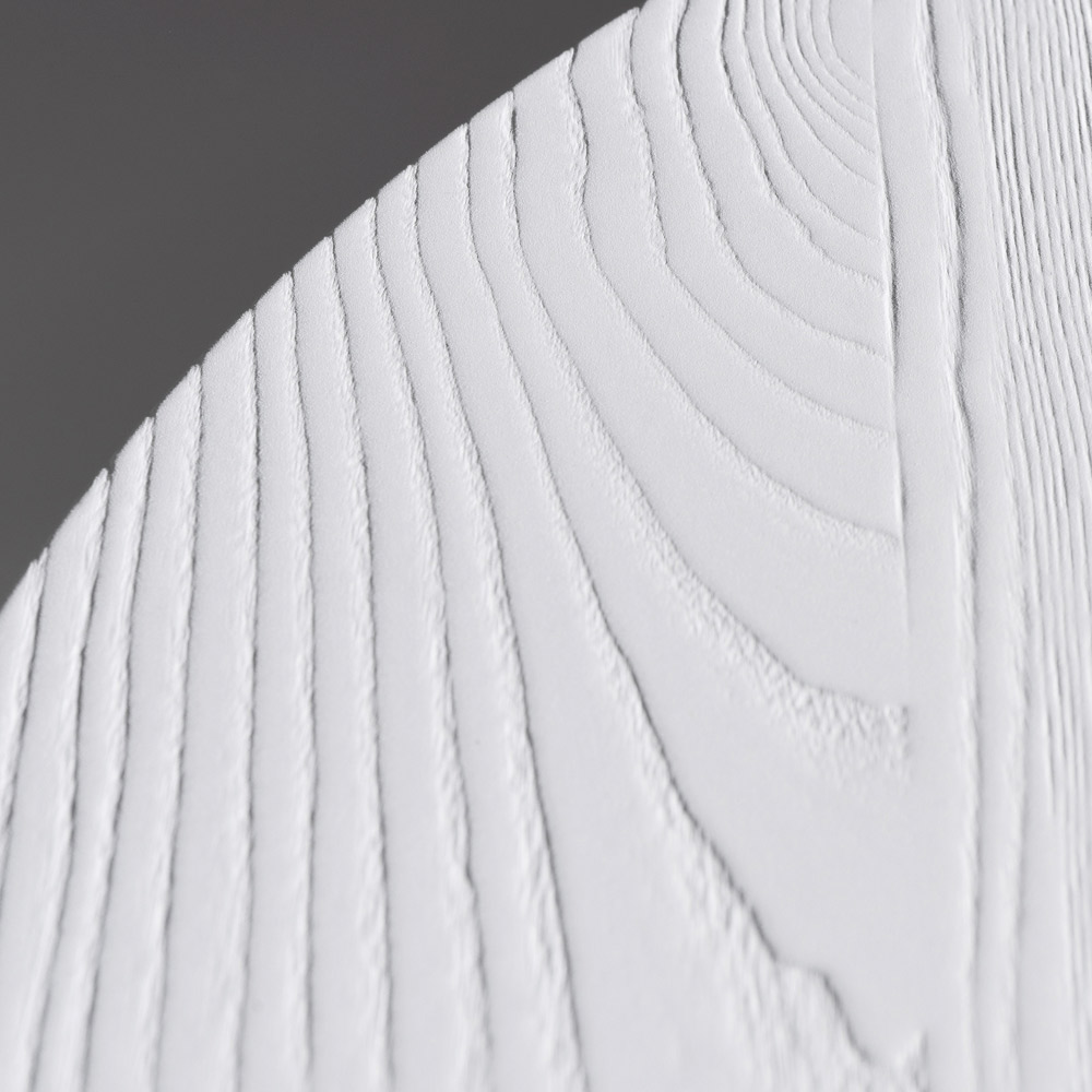 E punuar nga kompensatë me rimeso hiri të trajtuar me nxehtësi , tavolina nxjerr në pah fibrat natyrale të drurit, duke rritur karakterin e tij të teksturuar dhe thellësinë kromatike. Është gjithashtu e disponueshme me llak të zi ose të bardhë , duke e bërë atë mjaftueshëm të gjithanshme për t'u përshtatur me një sërë stilesh, nga minimaliste deri te të theksuara dhe grafike.