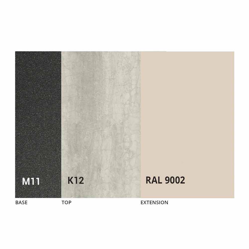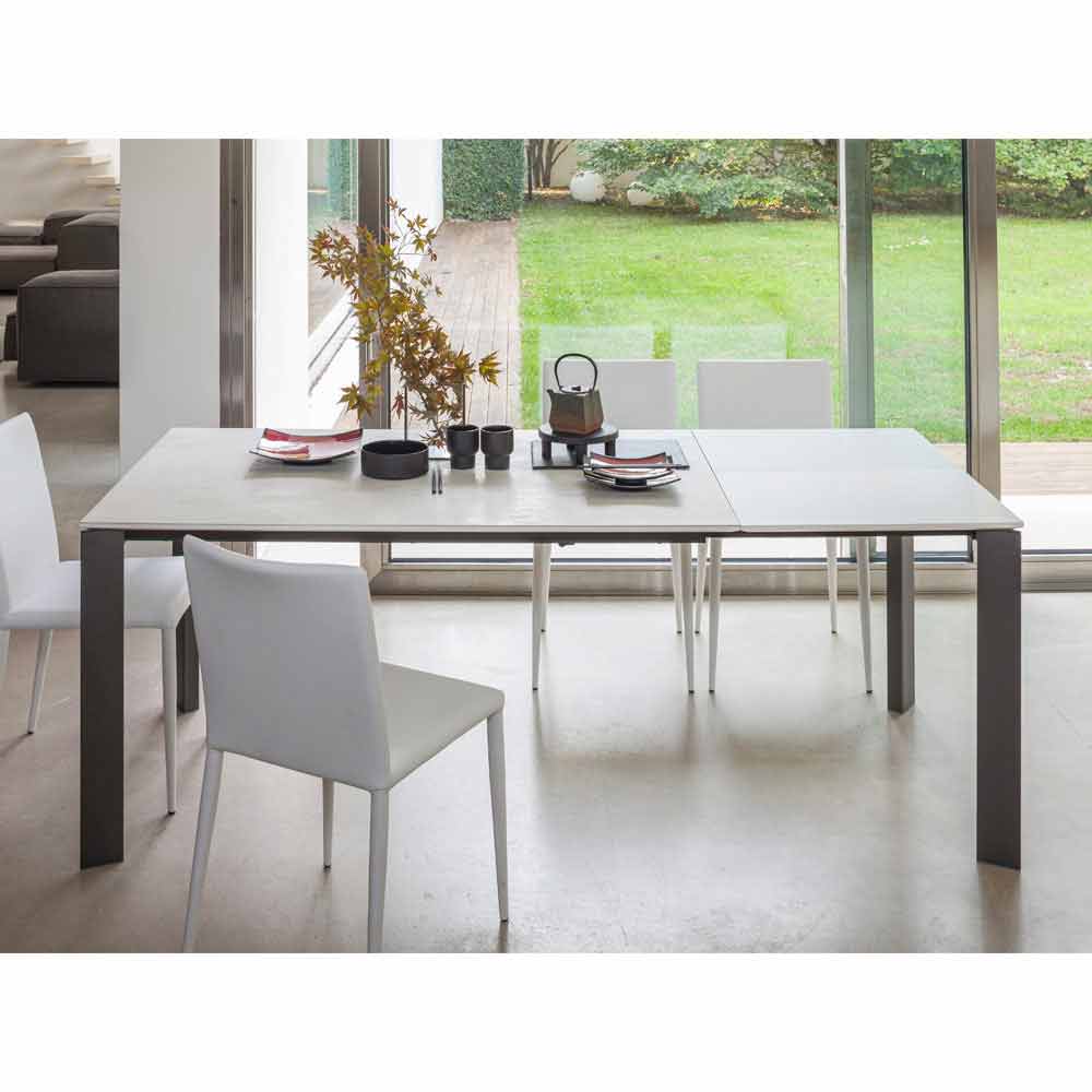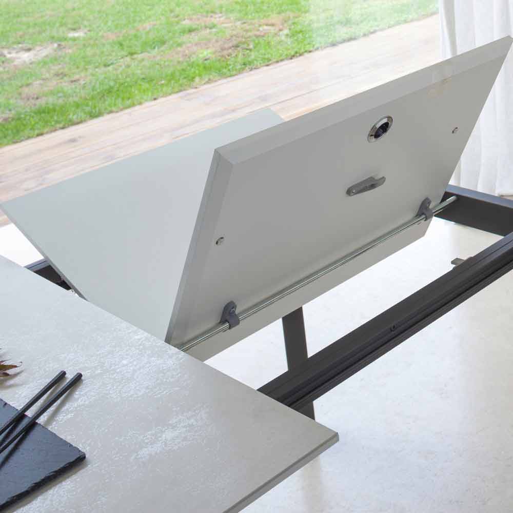Kjo tavolinë e zgjatur ka një dizajn shumë bashkëkohor dhe është e përshtatshme për çdo nevojë jetese, në gjendje të kombinojë shijen estetike me funksionalitetin dhe të japë një ndikim vizual dhe taktik shumë efektiv. Karakteristikën e saj të veçantë e jep forma trekëndore e këmbëve, e cila përshkruan një stil minimal dhe absolutisht elegant. E punuar me dorë në Itali me materiale të cilësisë së lartë dhe 100% e prodhuar në Itali. E karakterizuar nga një majë qeramike laminamenë një panel melamine dhe një bazë metalike e lyer me grafit të stampuar, pjesa e sipërme mund të zgjatet falë një mekanizmi teleskopik me një zgjatim të brendshëm të palosshëm në të njëjtën ngjyrë si paneli i poshtëm.