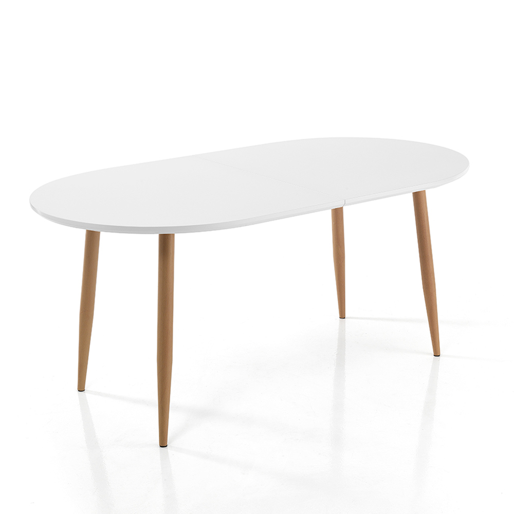 Tavolinë ngrënieje me pjesën e sipërme ovale të zgjatshme prej mdf të bardhë mat dhe këmbët me fije lisi . Pjesa e sipërme mund të arrijë një gjatësi prej 190 ose 220 cm falë dy zgjatimeve të jashtme prej 30 cm secila. Një produkt me një stil minimal dhe shkathtësi të lartë përdorimi i krijuar për ata që preferojnë orendi të thjeshta por me ndikim dhe për ata që duan të organizojnë dreka dhe darka në shoqëri dhe për këtë arsye kanë nevojë për një sipërfaqe të gjerë për të akomoduar një numër më të madh miqsh dhe të afërmsh.