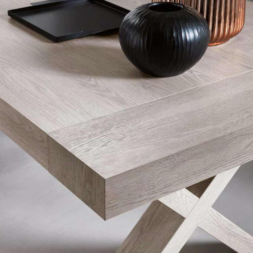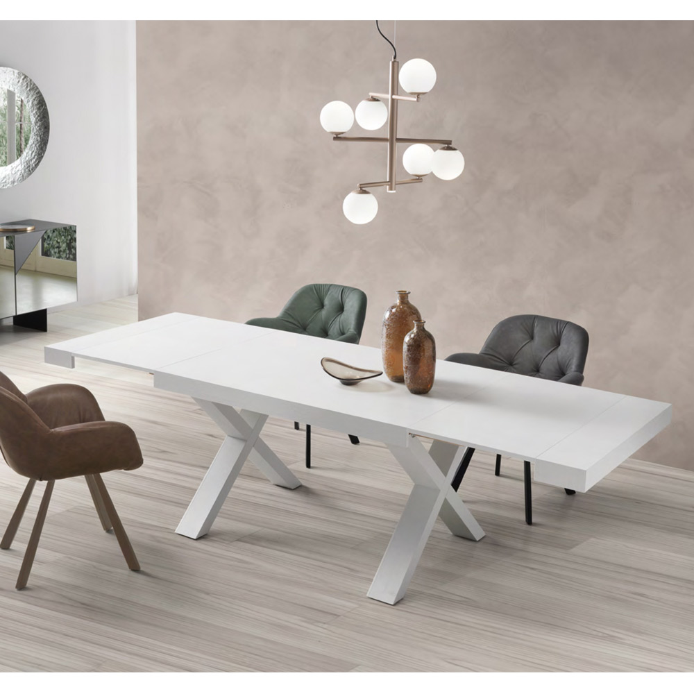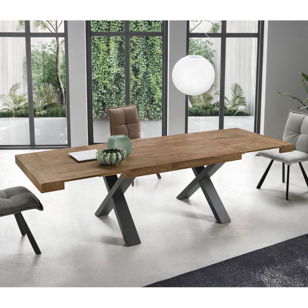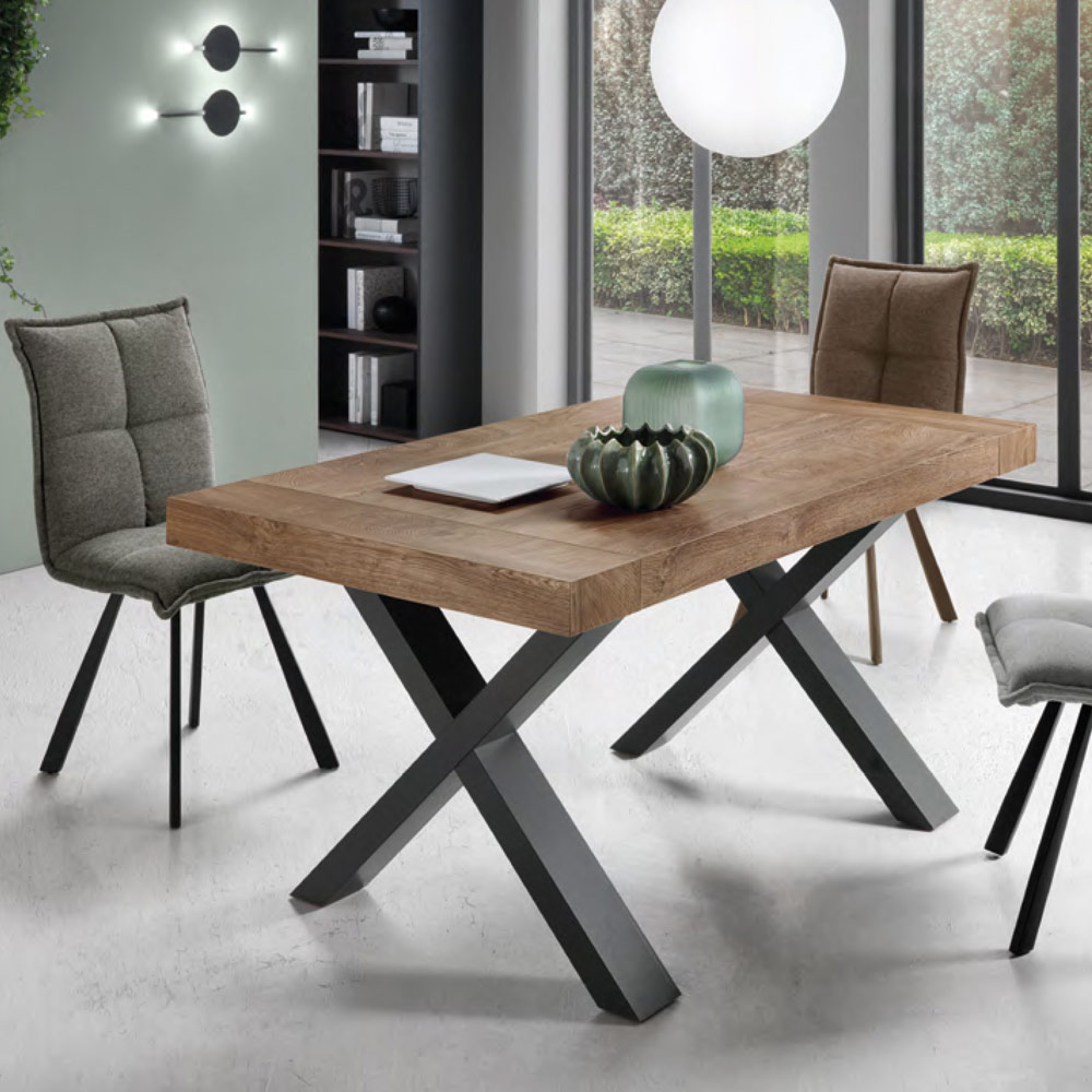 Tavolinë ngrënie tërësisht e prodhuar në Italime majë laminate, strukturë dhe zgjatime. Një mobilje veçanërisht moderne, ideale për ata që kërkojnë cilësi , elegancë dhe funksionalitet brenda një produkti të vetëm. Pjesa e sipërme elegante me efekt druri i jep tryezës një stil mbresëlënës, i aftë për të pushtuar rolin kryesor në dhomë falë përmasave të mëdha. Estetika e tij pasurohet dhe bëhet unike nga forma e veçantë e kryqëzuar e bazës e cila i ofron produktit soliditet dhe qëndrueshmëri si dhe i jep një prekje personaliteti ekskluziv dizajnit të tij përfundimtar.