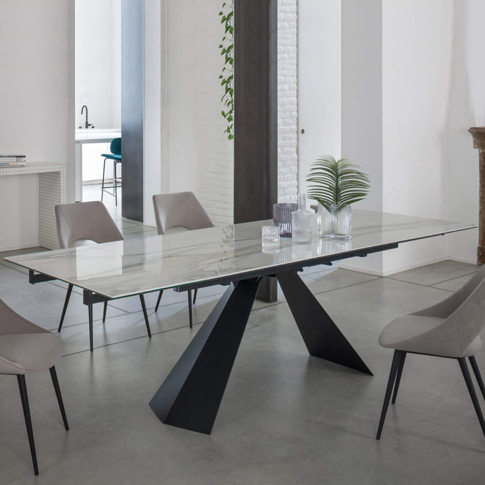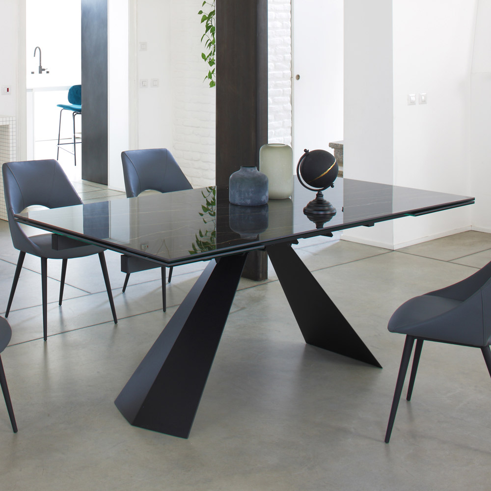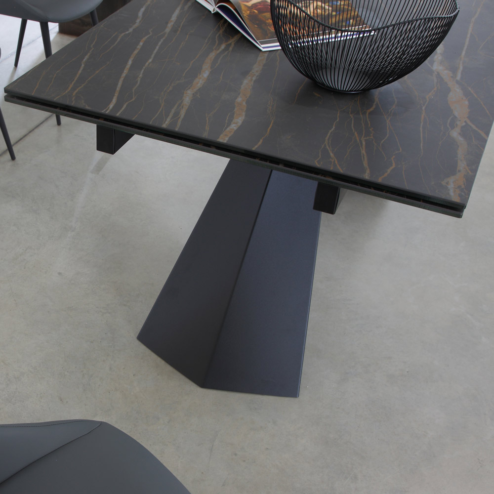 Tavolinë ngrënieje e zgjatur e përbërë nga një strukturë çeliku e lyer me ngjyrë të zezë dhe maja prej qelqi qeramike (trashësia 5 + 6 mm). Ideale për ata që duan një stil mobilimi thelbësor dhe të gjithanshëm, kjo pjesë e mobiljeve është në gjendje të plotësojë me shije dhe elegancë ambientin e dhomës së ngrënies apo kuzhinës së tyre. E veçanta e tij qëndron në pjesën e sipërme prej qelqi qeramike e cila është tepër e fortë dhe veçanërisht rezistente ndaj prerjeve, prerjeve dhe temperaturave të larta.