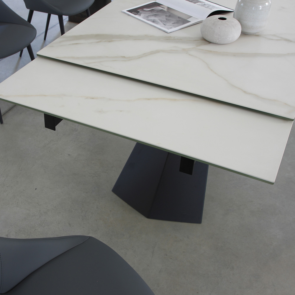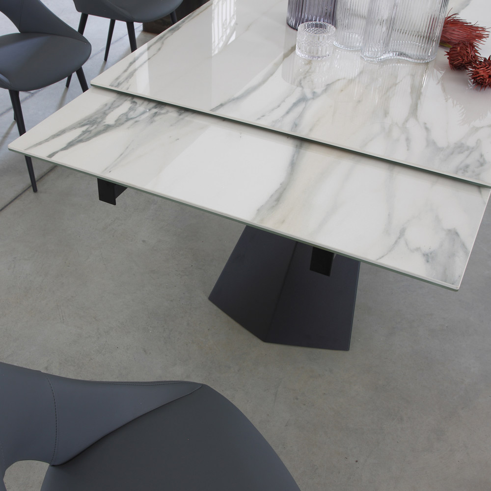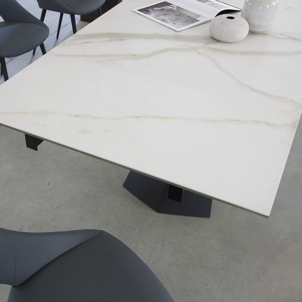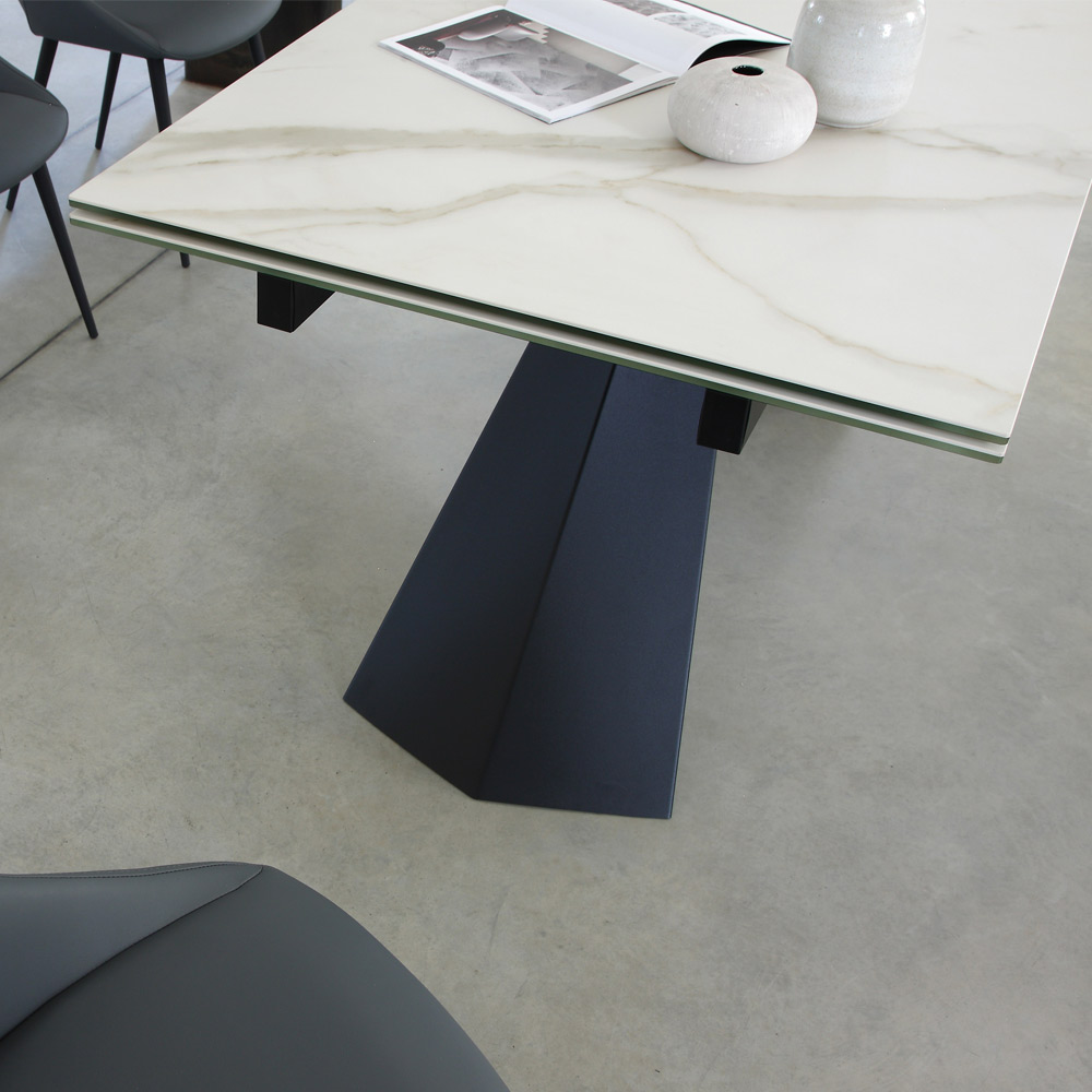 Tavolinë ngrënieje e zgjatur e përbërë nga një strukturë çeliku e lyer me ngjyrë të zezë dhe maja prej qelqi qeramike (trashësia 5 + 6 mm). Ideale për ata që duan një stil mobilimi thelbësor dhe të gjithanshëm, kjo pjesë e mobiljeve është në gjendje të plotësojë me shije dhe elegancë ambientin e dhomës së ngrënies apo kuzhinës së tyre. E veçanta e tij qëndron në pjesën e sipërme prej qelqi qeramike e cila është tepër e fortë dhe veçanërisht rezistente ndaj prerjeve, prerjeve dhe temperaturave të larta.