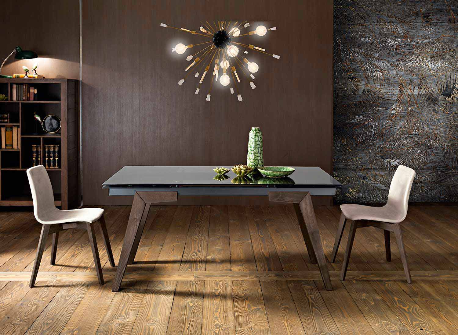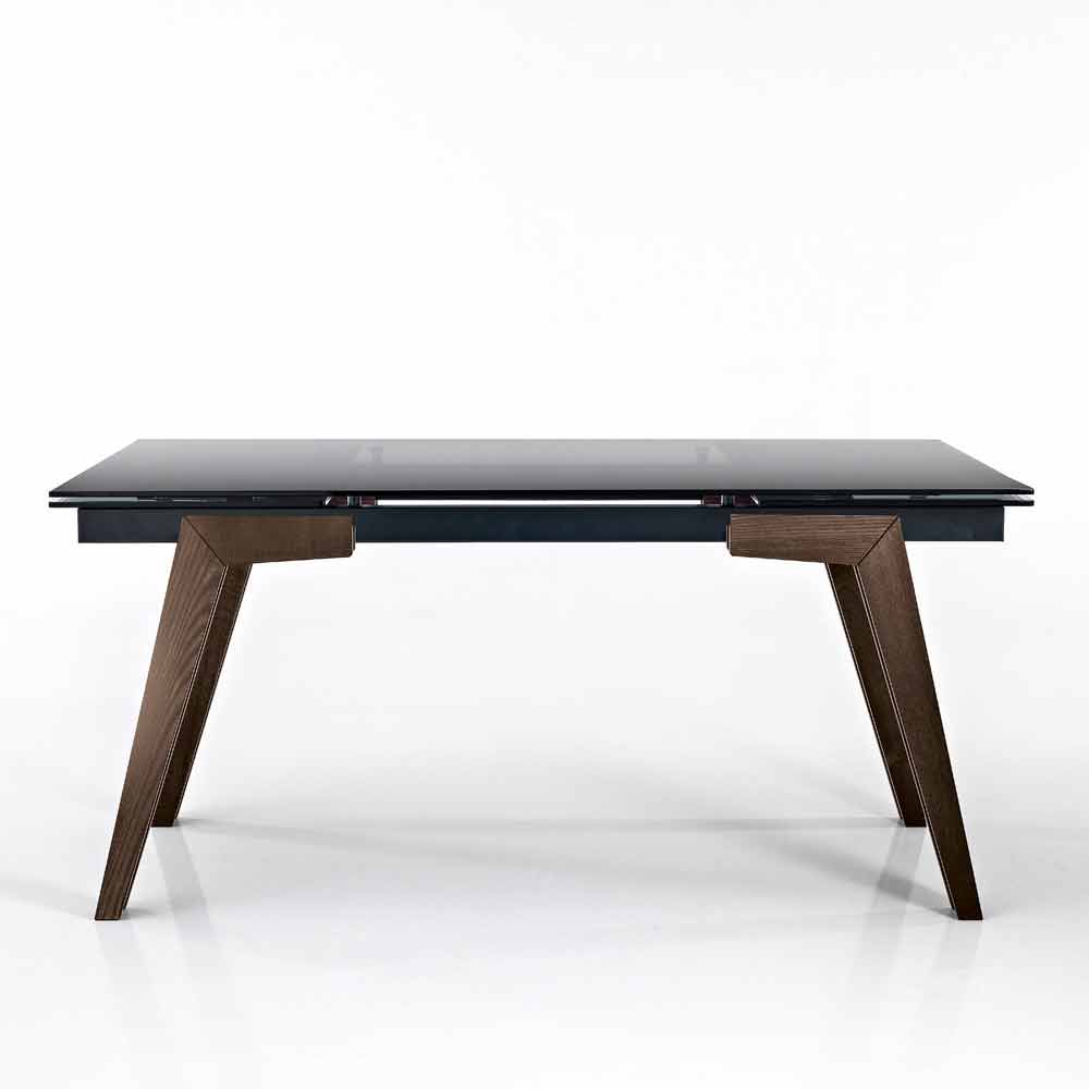 Dimitri është një tryezë elegante e zgjatshme e realizuar në Itali me një sipërfaqe xhami të zbutur me tym (trashësi 10 mm) dhe një sipërfaqe druri të ngurtë lisi të disponueshme në dy përfundime të ndryshme: