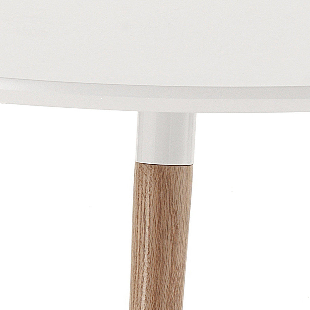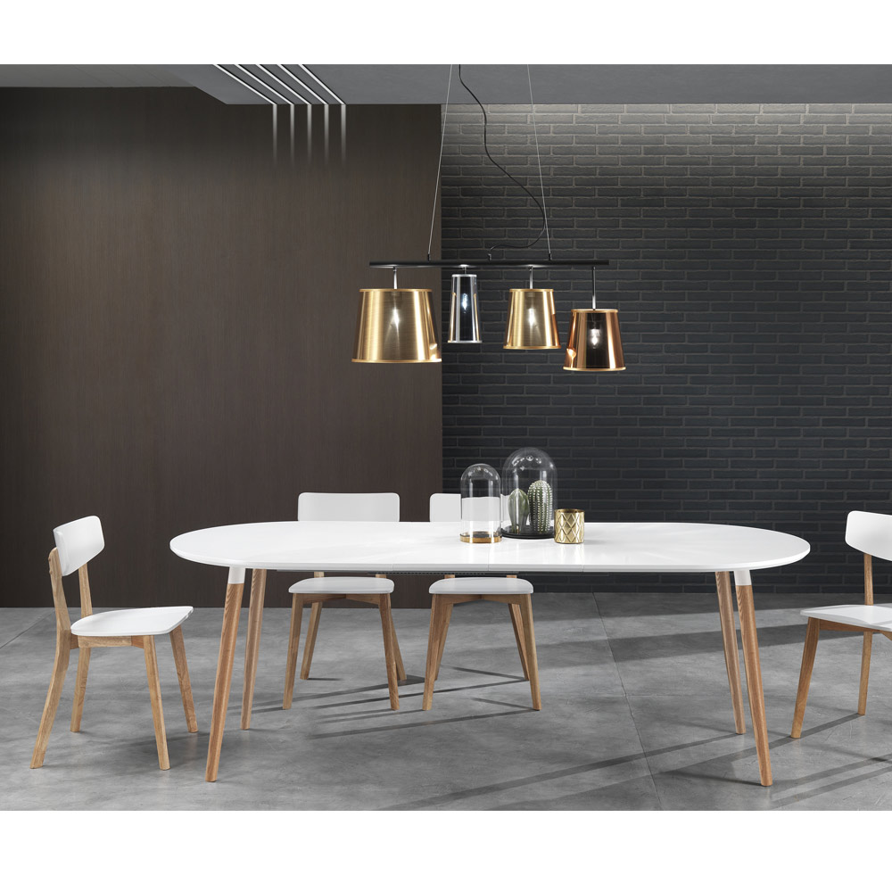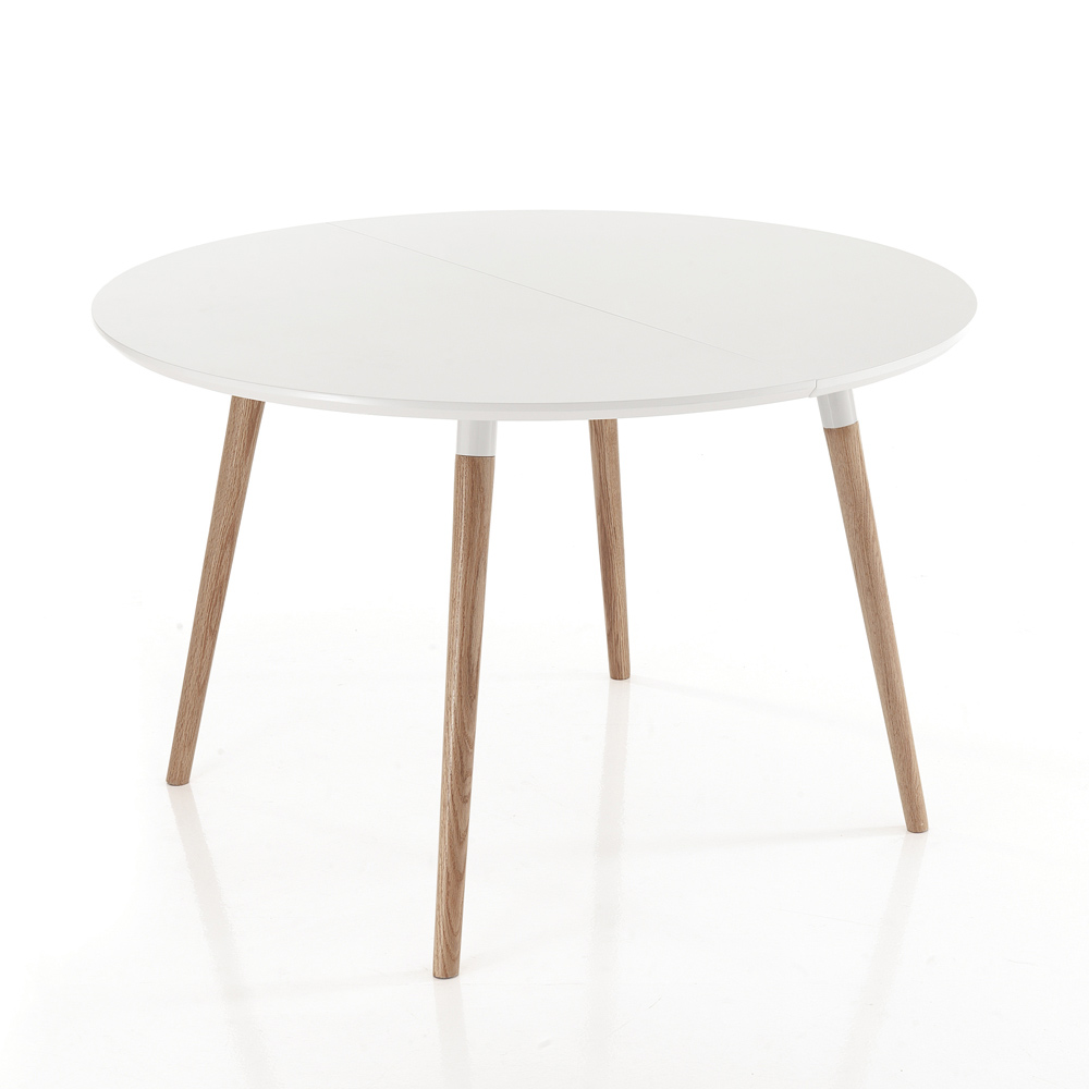 Tavolinë e rrumbullakët e ngrënies me majë prej mdf me llak të bardhë mat dhe këmbë prej druri të fortë me finiturë lisi . Një produkt me një dizajn të thjeshtë dhe të pastër, ideal për ata që duan një stil thelbësor dhe të gjithanshëm mobiljesh të aftë për të kompletuar stilin e dhomës së ngrënies ose kuzhinës së tyre me shije dhe personalitet. Pika e fortë e tij përfaqësohet nga pjesa e sipërme e zgjatshme e cila falë dy zgjatimeve nga 50 cm secila, arrin një gjatësi prej 170 ose 220 cm.