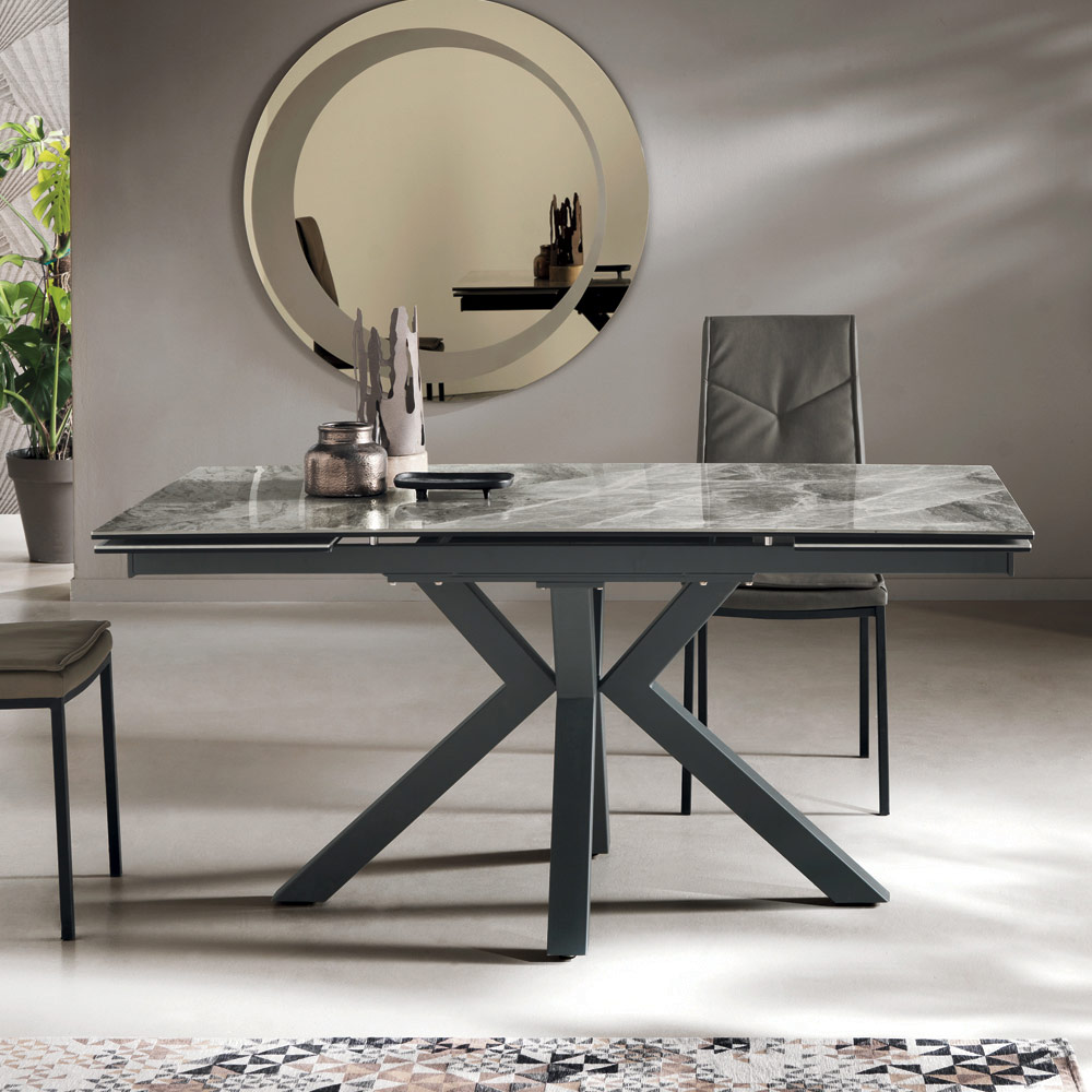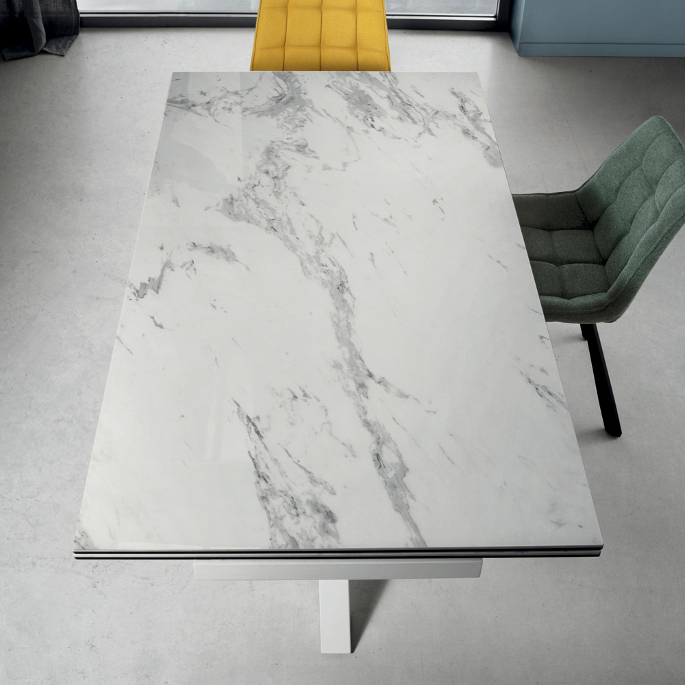Tavolinë ngrënieje e zgjatur me majë guri prej porcelani me efekt mermeri dhe bazë metalike të lyer me linja të thjeshta dhe moderne, e aftë për t'i dhënë karakter ambientit tuaj. E pajisur me 2 zgjatime anësore prej 40 cm dhe një mekanizëm rrotullues që ju lejon të zgjasni shpejt dhe me lehtësi pjesën e sipërme të tavolinës për një rezultat funksional dhe veçanërisht origjinal .