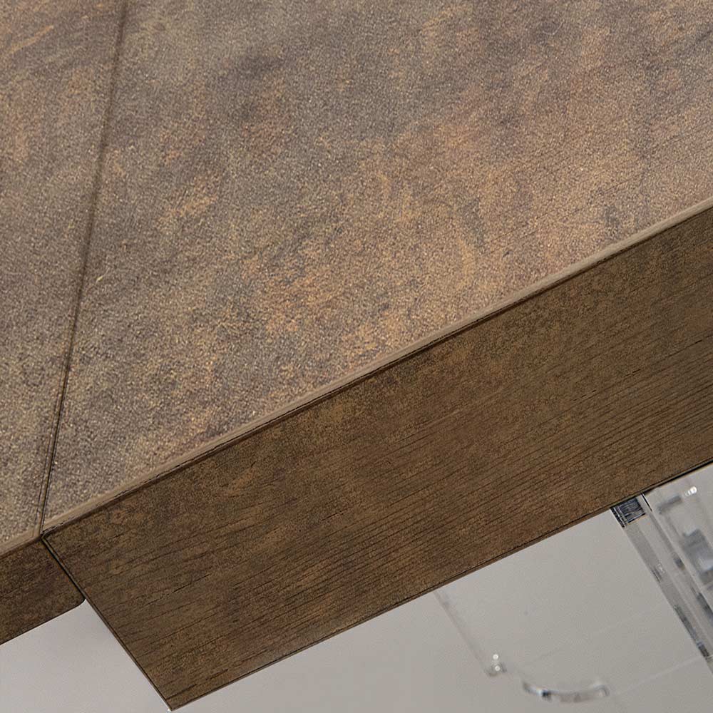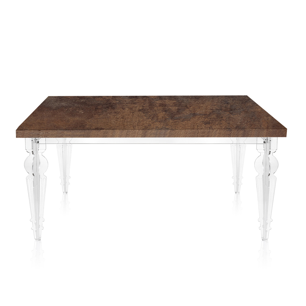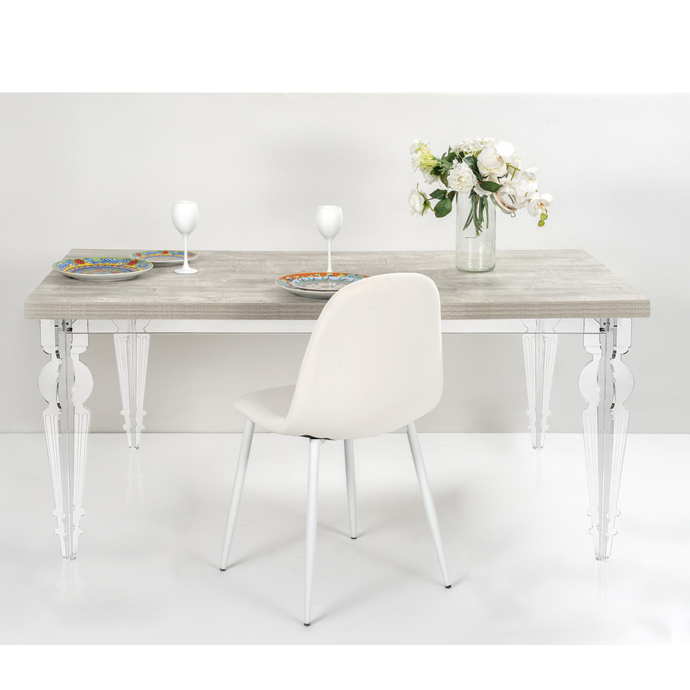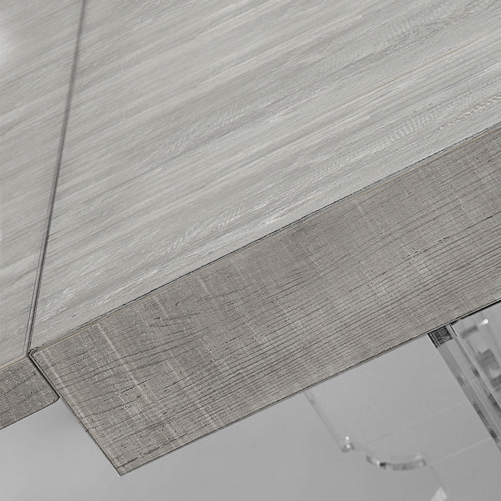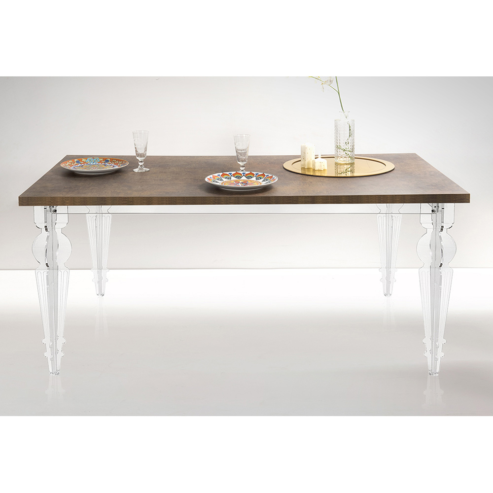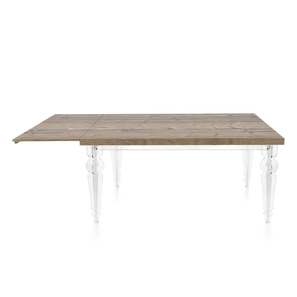 Tavolinë ngrënieje e zgjatur deri në 255 cm (10 vende) me strukturë PMMA pleksiglas nga polimer i virgjër dhe sipër me esencë druri të fisnikëruar që garanton qëndrueshmëri dhe mosdeformueshmëri , për një efekt lehtësie ekstreme dhe harmoni totale. Një mobilie që ndihmon për të arreduar me shije dhe personalitet sallonin e çdo ambienti banimi modern duke ofruar funksionalitet të pashembullt falë majës së zgjatshme që mund të strehojë deri në 10 persona për dreka dhe darka me miqtë.