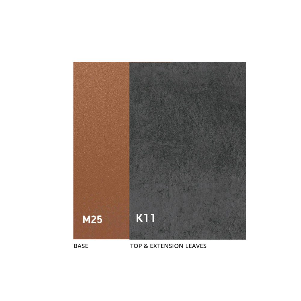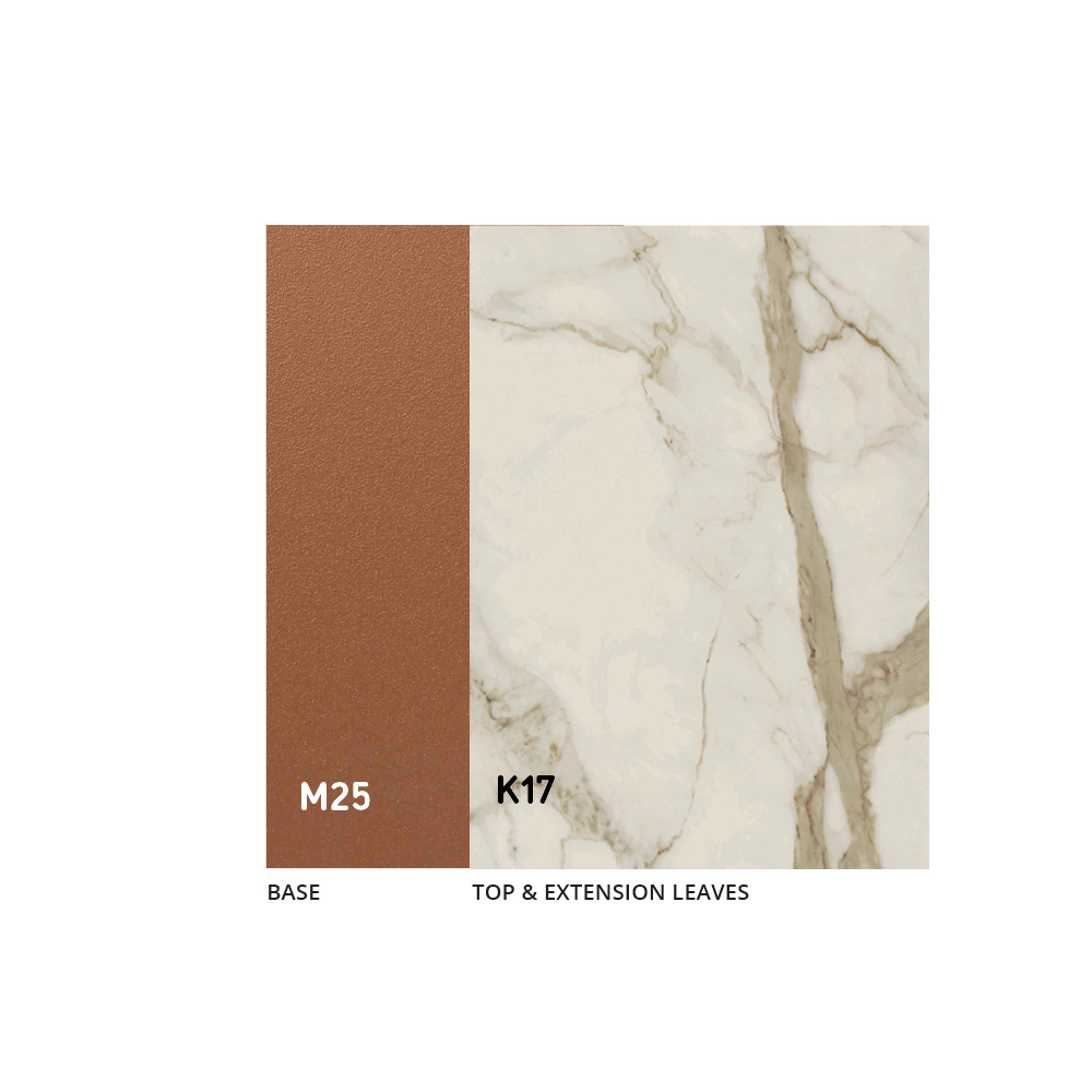 Tavolinë e bërë me kornizë metalike të lyer me bakër të stampuar dhe sipërfaqe qeramike 3 mm.