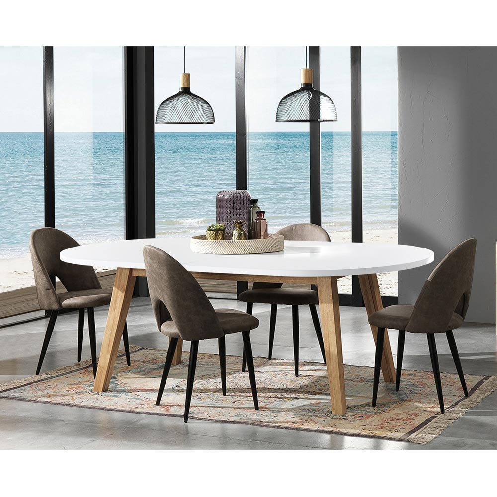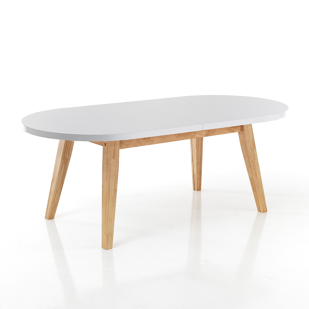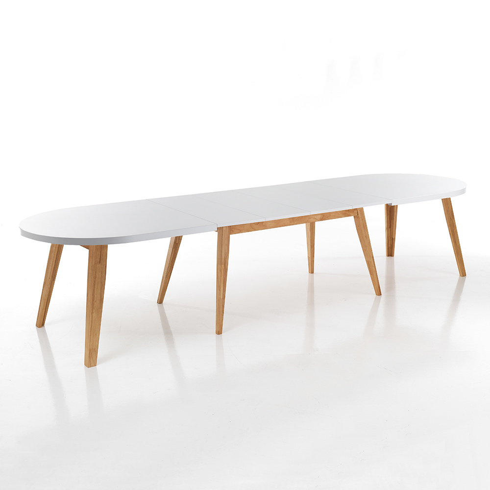 Tavolinë ngrënieje me pjesën e sipërme ovale të zgjatshme e bërë nga mdf me llak të bardhë gjysmë shkëlqyese (trashësia 5cm) dhe strukturë prej druri të fortë me finiturë lisi . Një estetikë imponuese dhe moderne e karakterizuar nga forma të thjeshta për një rezultat me një shkathtësi të lartë përdorimi. Ana funksionale e saj nënvizohet dhe theksohet nga 4 zgjatimet prej 30 cm secila të pozicionuara poshtë sipërme që lejojnë tavolinën të arrijë një gjatësi maksimale prej 300 cm. Kjo veçori e bën atë të përsosur për ata që duan të organizojnë dreka dhe darka në shoqëri dhe për këtë arsye kërkojnë një hapësirë që mund të strehojë të gjithë mysafirët e tyre në një mënyrë optimale.