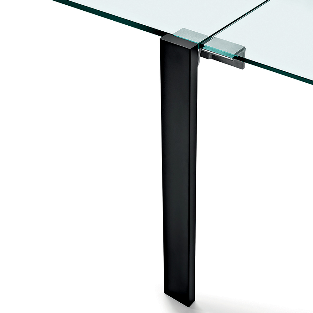 Tavolinë qelqi jashtëzakonisht e tejdukshme që mund të zgjerohet deri në 170 cm me bazë metalike, e prodhuar në Itali.