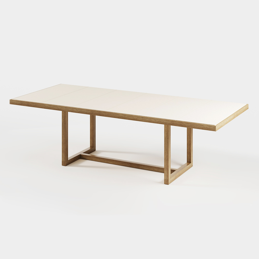 Tavolinë ngrënieje kopshti e punuar me bazë druri Iroko dhe pllakë guri . Ai vjen nga elementë minimalë dhe funksionalë, karakteri i të cilave rrjedh nga vëmendja ndaj detajeve dhe nga përmasat e kombinimet e elementeve horizontale dhe vertikale. Dizajni i majës së saj karakterizohet nga pllaka të ndryshme guri që konturojnë pjesën e sipërme, duke i dhënë tryezës karakter dhe personalitet.