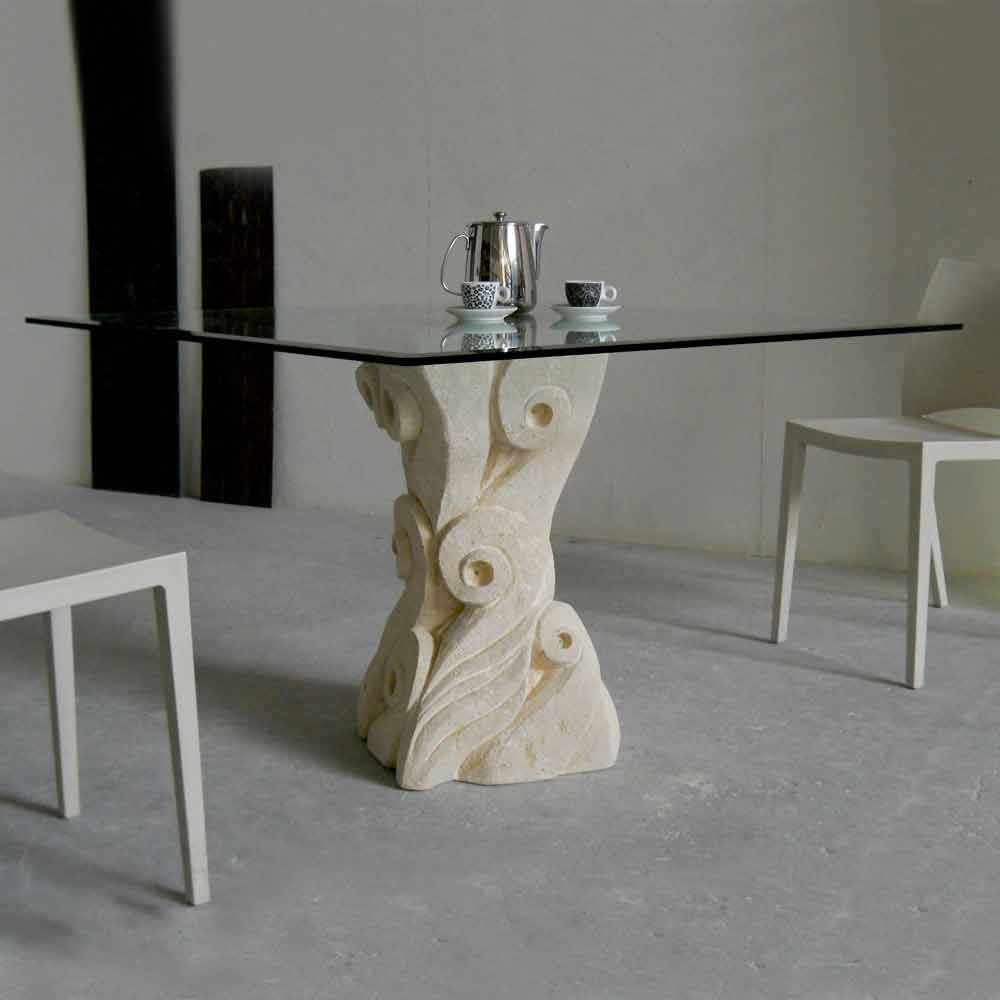Tavolina e ngrënies Giasone është bërë plotësisht në Itali. Baza e saj është prej guri natyror Vicenza dhe është gdhendur me dorë nga blloku origjinal i gurit. Pjesa e sipërme e tryezës është prej kristali float (trashësi 15 mm) e cila është siguruar në bazë me një fllanxhë çeliku të nxjerrë.