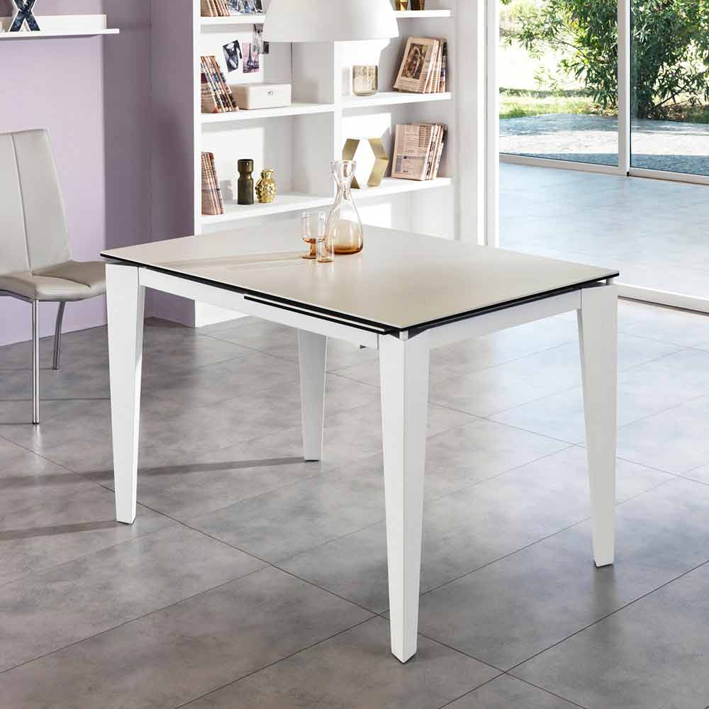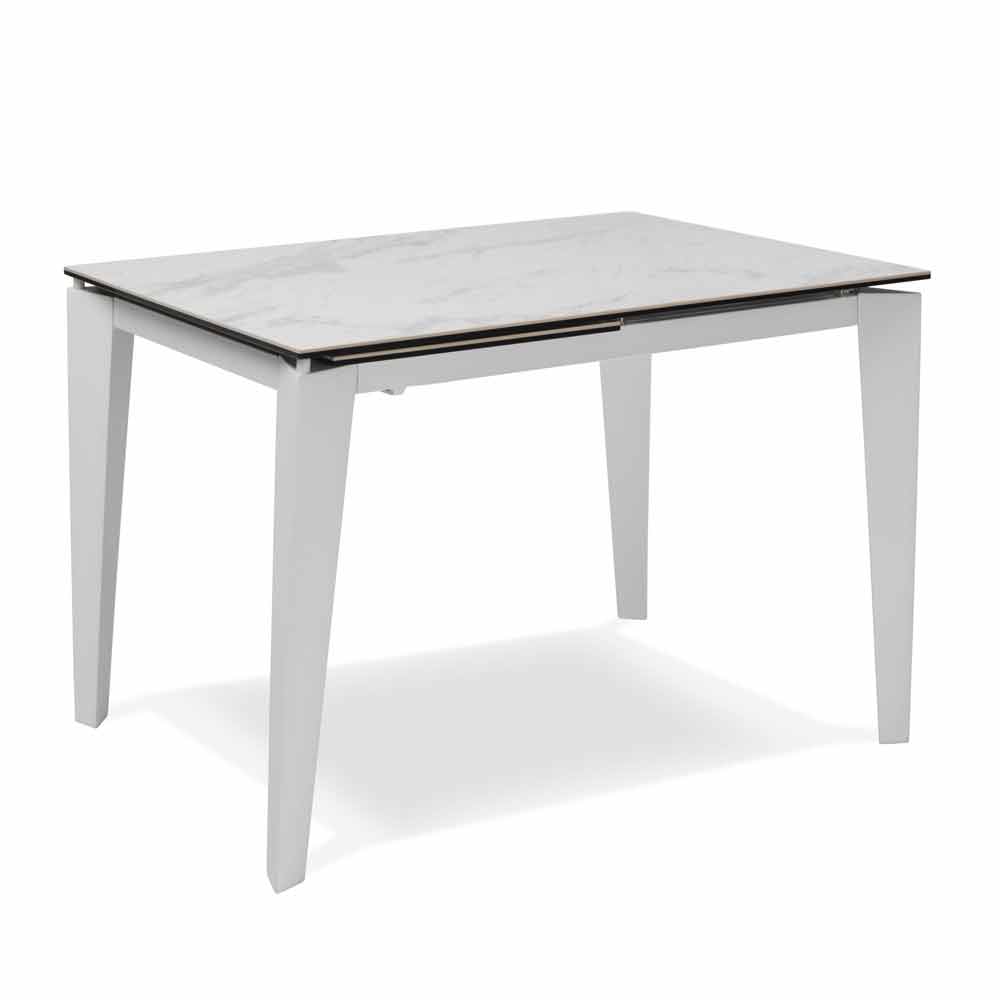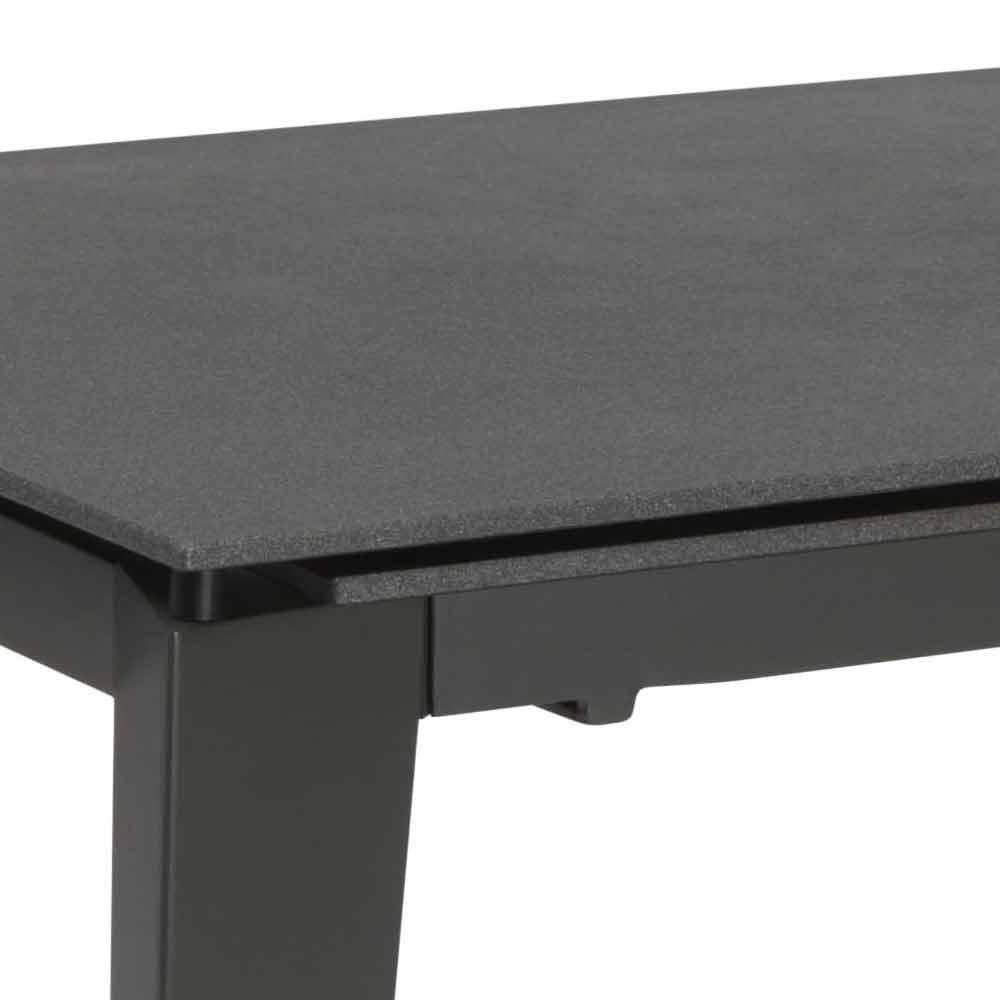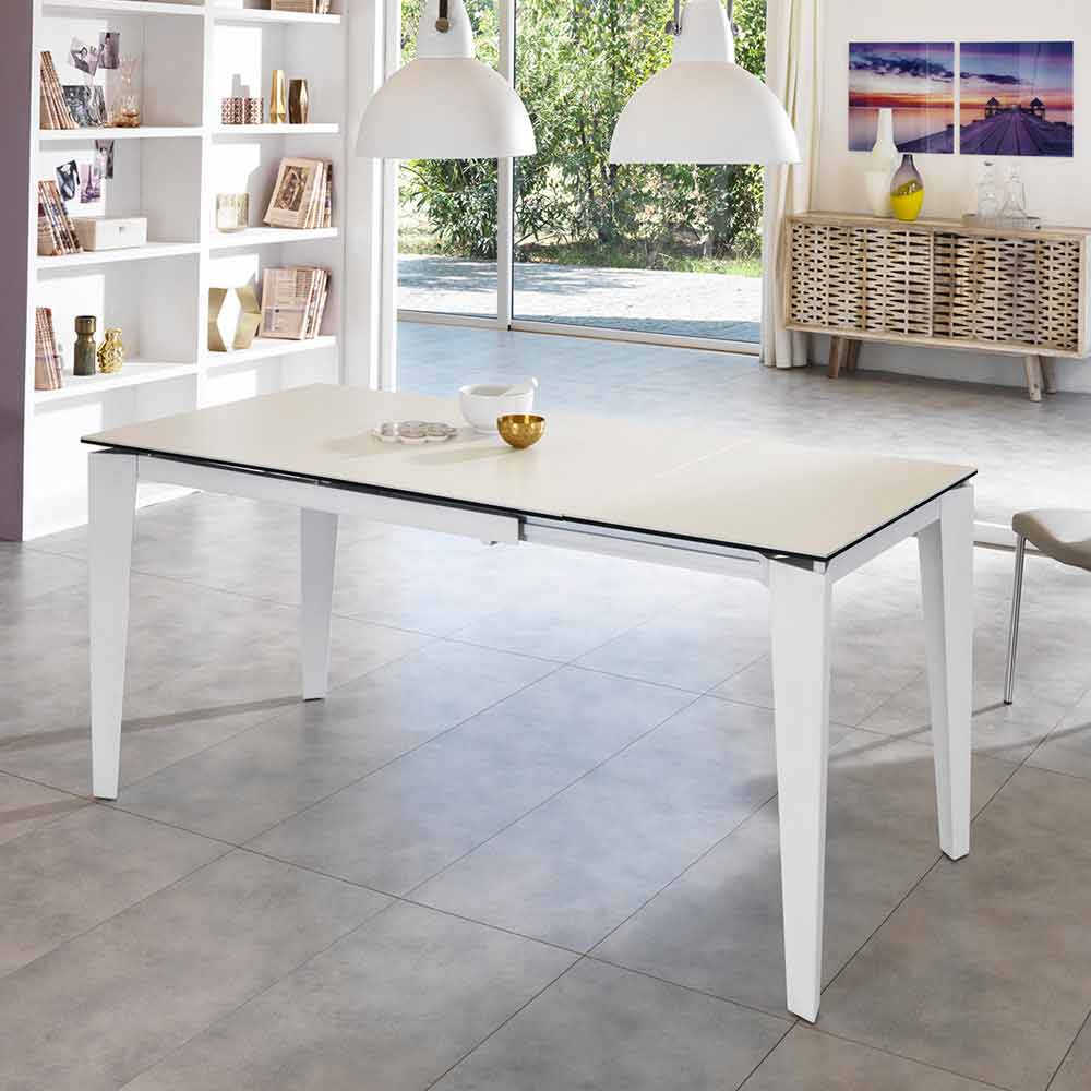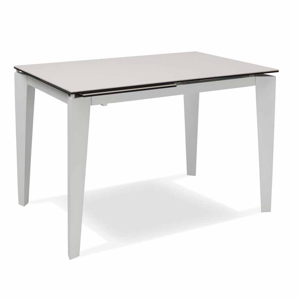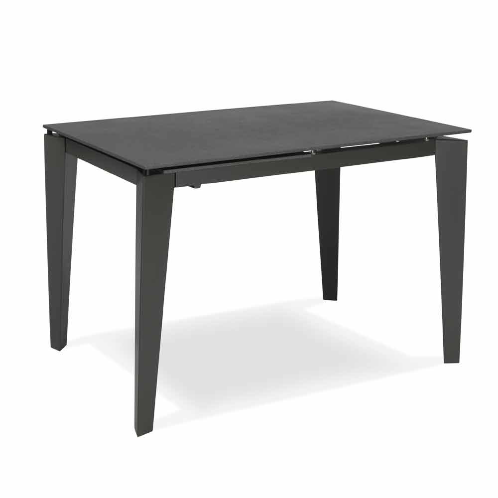 Tavolinë drejtkëndëshe e zgjatur me bazë metali të pikturuar mat. Pjesa e sipërme dhe shtrirja në qelq dhe qeramikë (shtresa e poshtme në xham, shtresa e sipërme në qeramikë). Falë shtrirjes praktike, është e mundur të zgjasni tryezën deri në një gjatësi prej 170 cm.