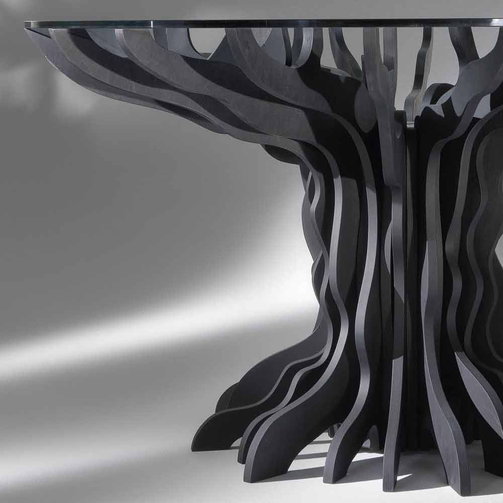 Tavolinë ngrënieje moderne e rrumbullakët Cassia me bazë druri të zezë dhe sipërfaqe kristali, e prodhuar në Itali Tavolina Cassia karakterizohet nga një dizajn modern dhe është bërë me dru thupre shumështresor me sipërfaqe të zezë të llakuar mat. Pjesa e sipërme është bërë nga kristal i temperuar jashtëzakonisht i tejdukshëm.