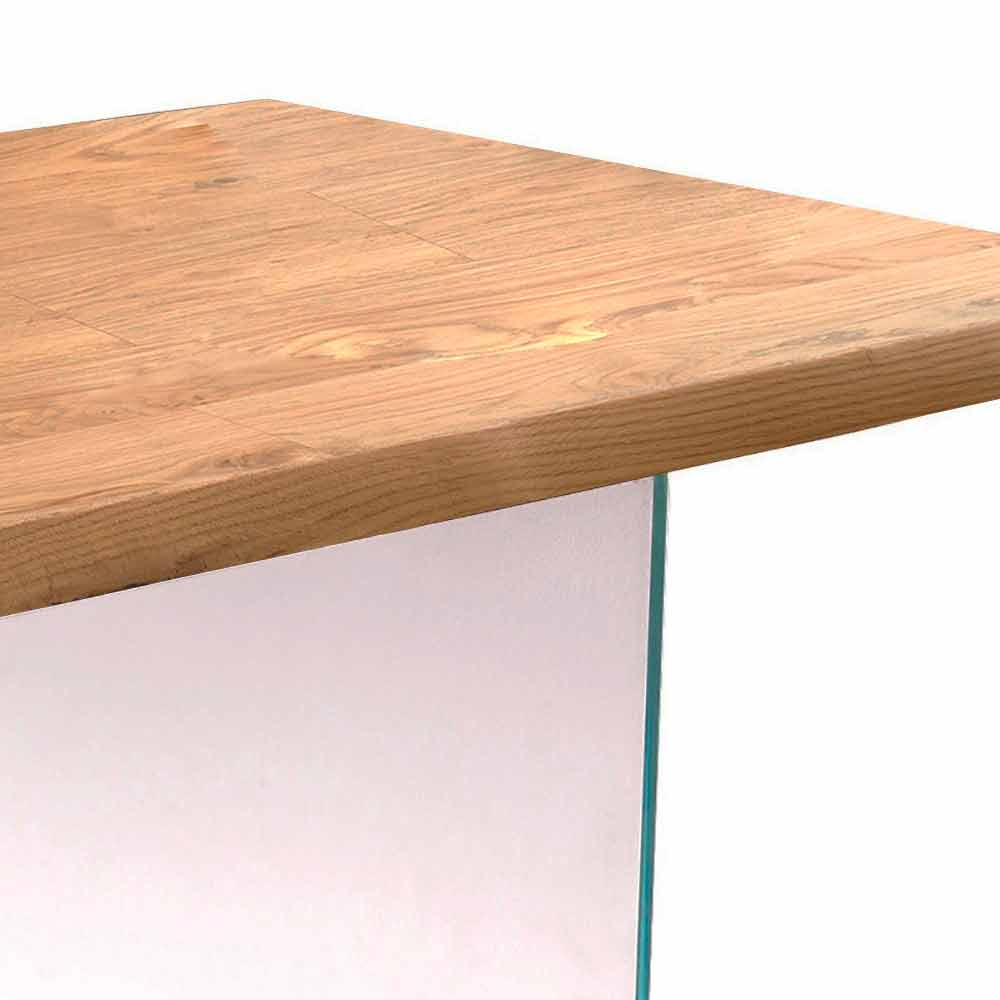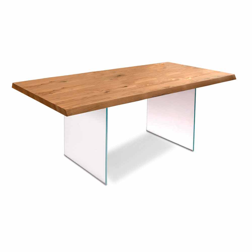 Tavolinë moderne ngrënie me rimeso lisi, këmbë xhami Nico