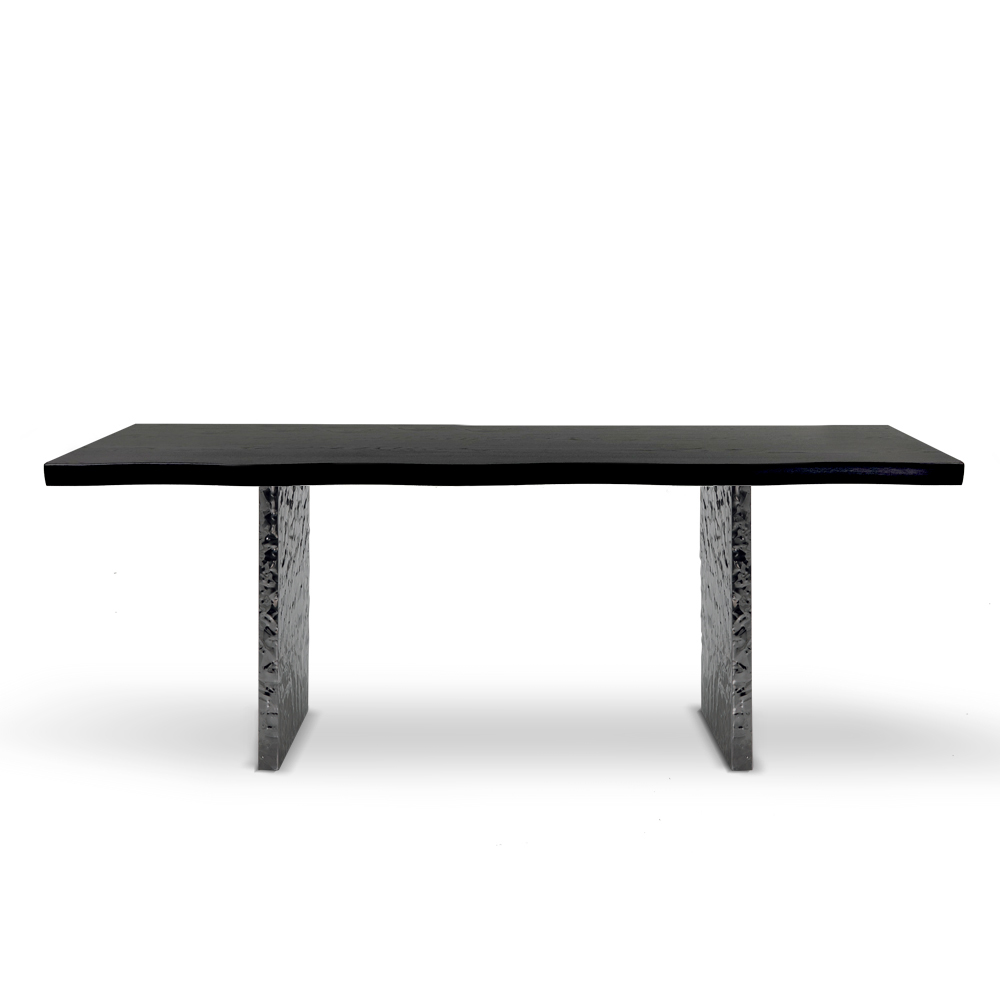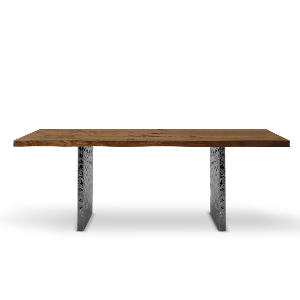 Tavolinë e projektuar me majë druri të rimeso dhe bazë çeliku të punuar me çekiç të punuar me dorë në Itali.