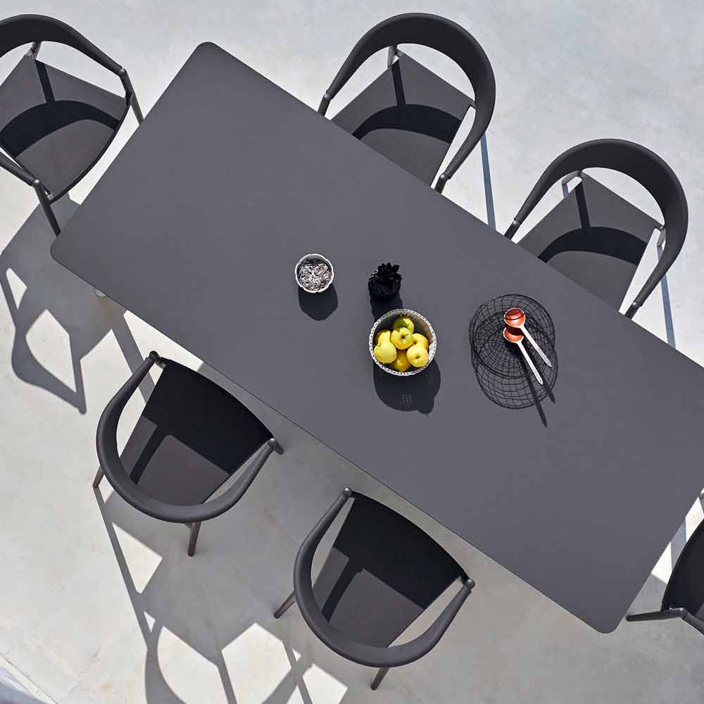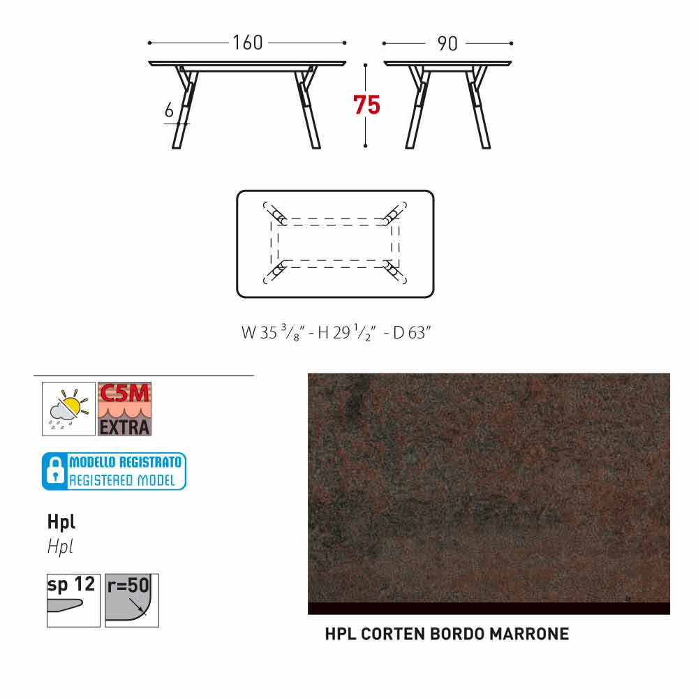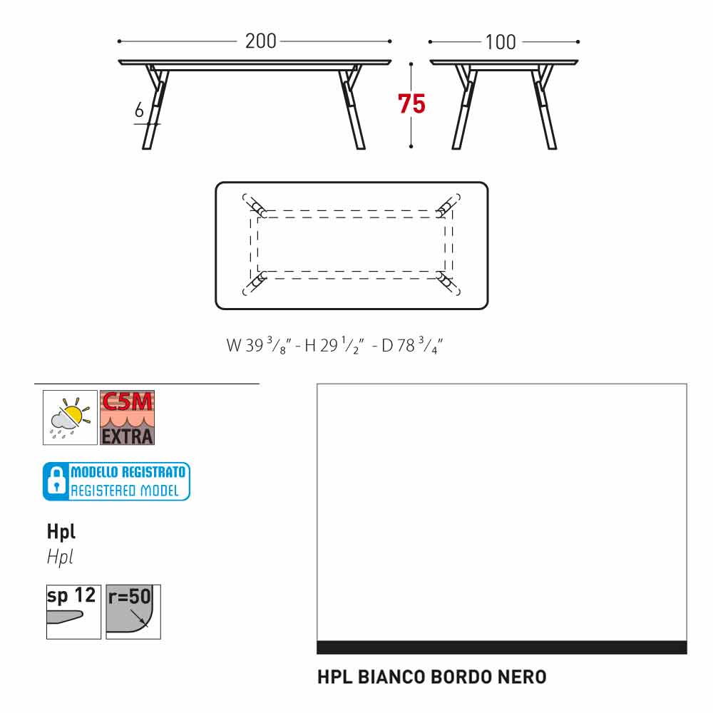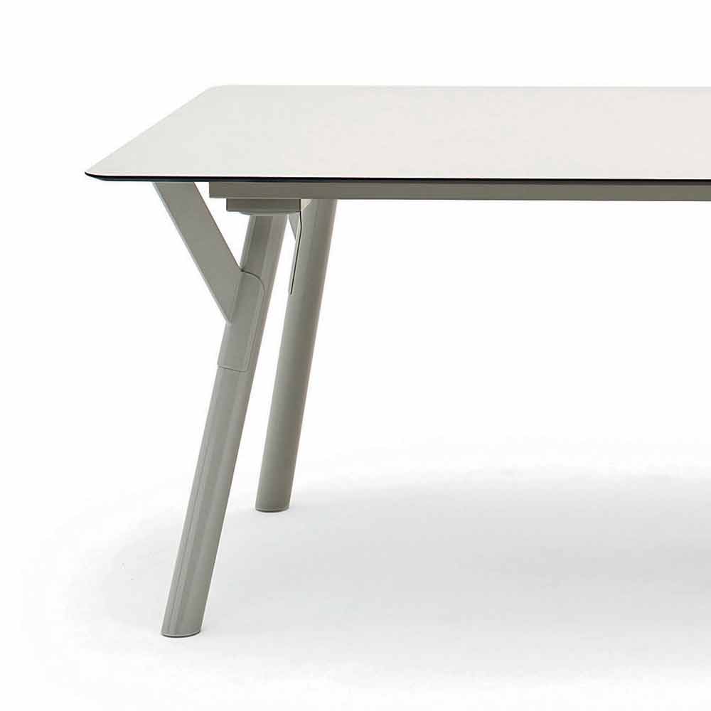 Lidhja në tryezë ka një kornizë të pikturuar çeliku inox (kllapa + këmbët). Maja është në dispozicion në HPL (12 mm e trashë) ose në dru tik (të trasha 30 mm). Falë modelit të tij të gjithanshëm, mund ta përdorni si një tryezë kopshtesh, qoftë si një tryezë shtëpie. Ju mund ta rregulloni lidhjen e tabelës duke zgjedhur midis dimensioneve të disponueshme dhe përfundimeve.