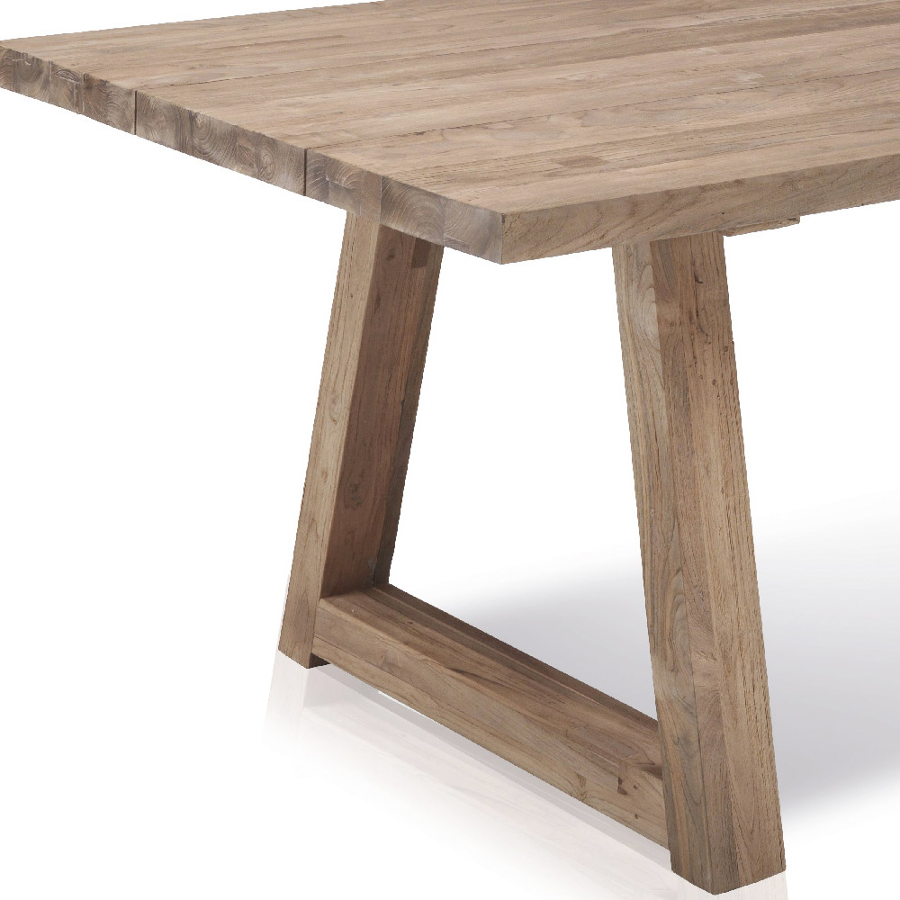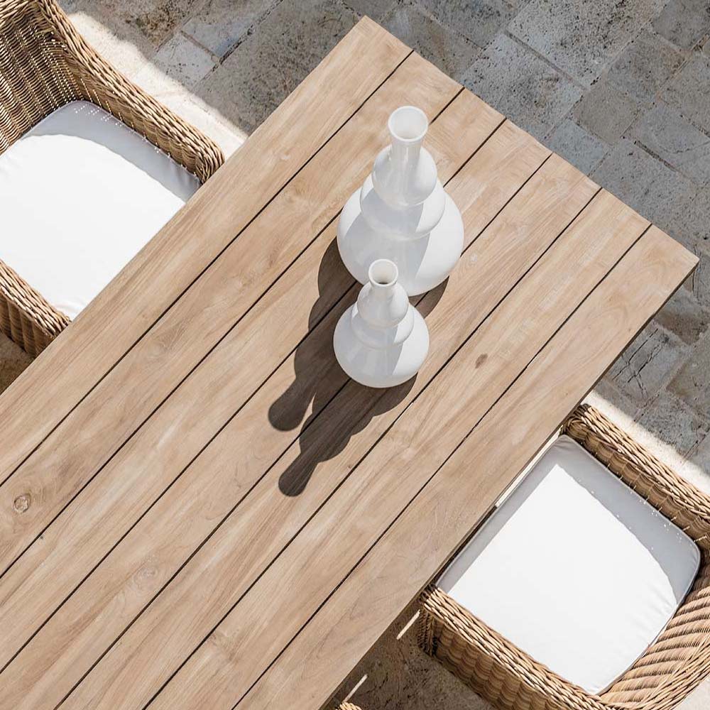 Tavolinë ngrënieje për kopsht e bërë nga dru tik i ricikluar, e punuar tërësisht në Itali. Kjo tavolinë është e përshtatshme për çdo ambient të jashtëm, nga dhoma e ndenjes në dhomën e ngrënies, madje edhe pranë pishinës, falë materialit rezistent ndaj motit të përdorur. Përfundimet e saj të thjeshta dhe lineare e bëjnë tavolinën një ide origjinale për këdo që kërkon të mobilojë hapësirën e tij të jashtme me shije dhe stil, pa sakrifikuar funksionalitetin dhe praktikën.