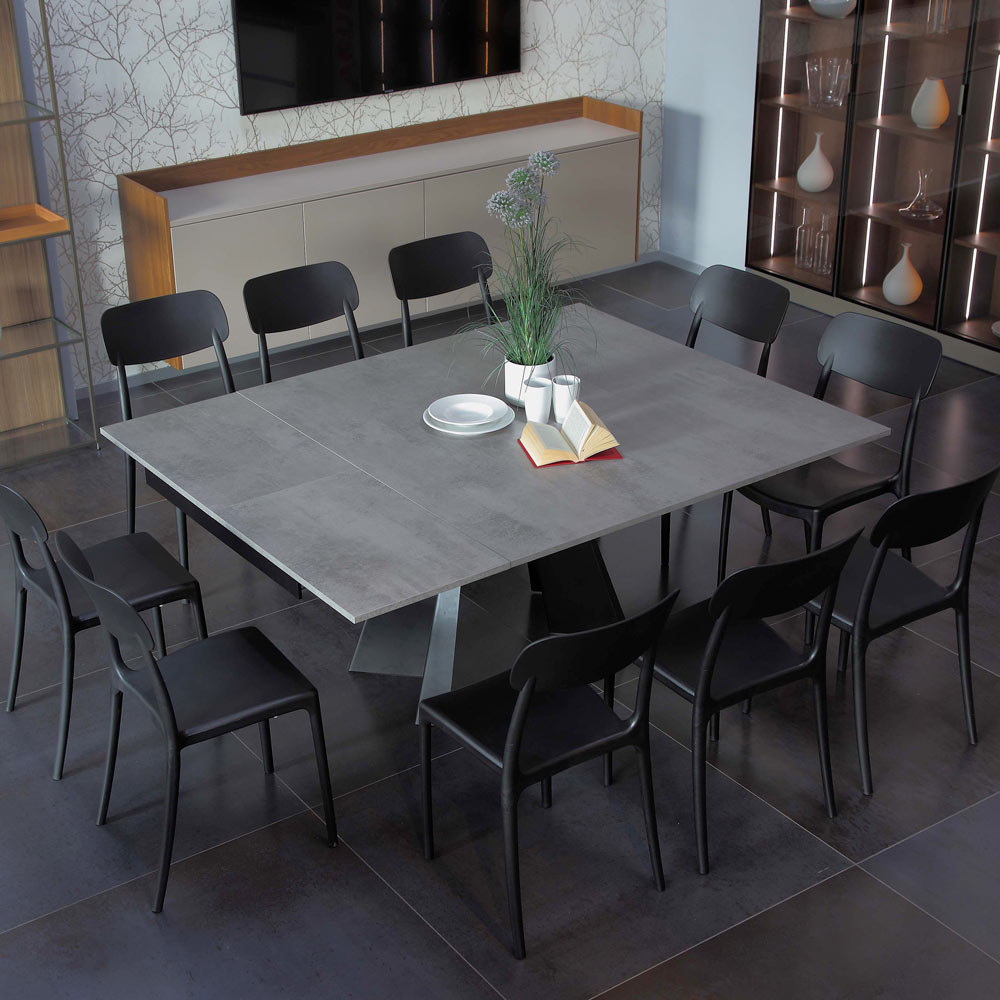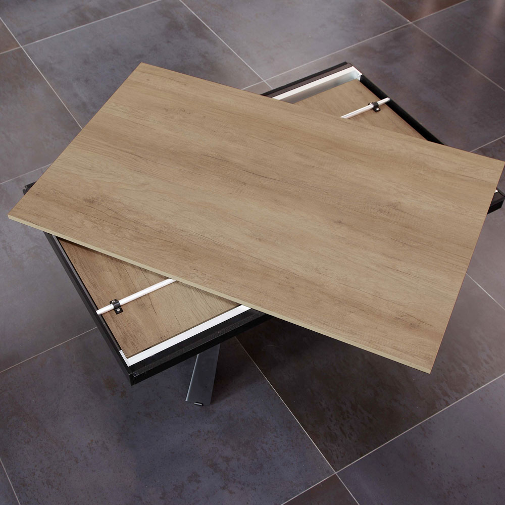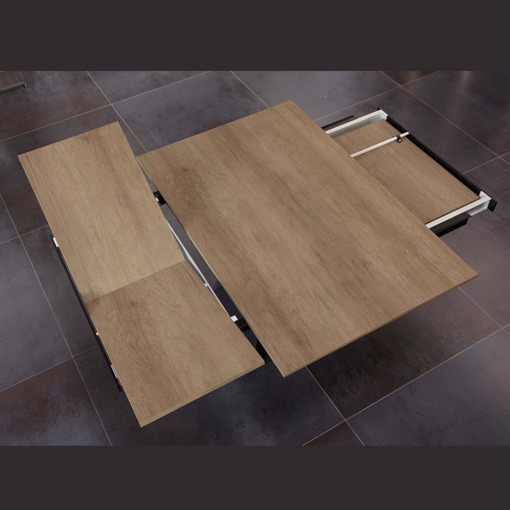 Tavolinë ngrënie e punuar me majë melamine, bazë metalike e lyer me ngjyrë të zezë me udhëzues dhe kornizë strukturore tërësisht në alumin. Ky artikull me një dizajn modern është i përsosur për t'u përfshirë në ambientet e ndenjes, kuzhinat dhe dhomat e ndenjes me një stil elegant dhe bashkëkohor. Mundësia për t'u zgjatur dhe zgjeruar do të thotë që ai përshtatet me të gjitha nevojat dhe rastet e përdorimit, për të ftuar miqtë dhe të afërmit dhe për të krijuar momente unike dhe të paharrueshme të rehatisë.