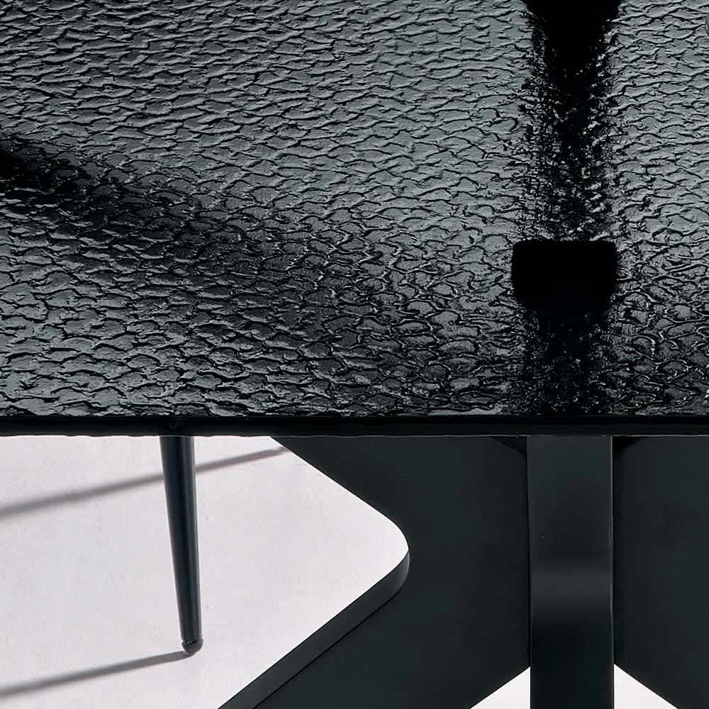 Baza metalike e lyer me të zezë siguron stabilitet dhe qëndrueshmëri, duke e kompletuar dizajnin me një prekje moderne dhe thelbësore. Kombinimi i qelqit të dekoruar dhe kornizës metalike krijon një ekuilibër të përsosur midis elegancës dhe funksionalitetit, duke e bërë tavolinën të përshtatshme si për hapësirat shtëpiake ashtu edhe për ato bashkëkohore.