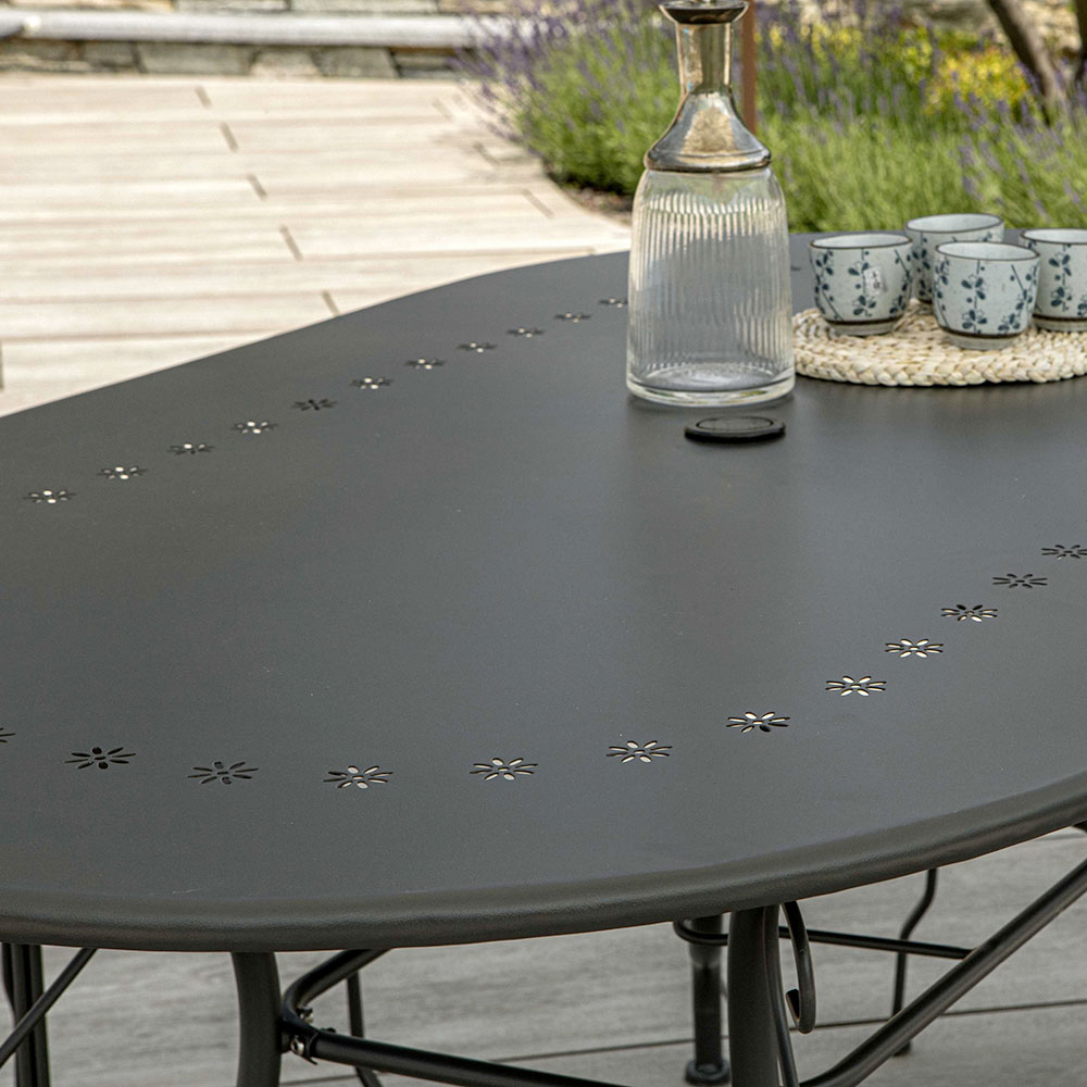 Sipërfaqja e tavolinës është e zbukuruar me një model delikat të shpuar , i cili jo vetëm që i shton një prekje të përsosur dizajnit, por gjithashtu siguron prakticitet duke lehtësuar kullimin e ujit, duke e bërë atë ideale për përdorim në natyrë. Finitura e bën të lehtë përshtatjen e çdo stili të mobiljeve të jashtme, nga më klasikët tek ato moderne.