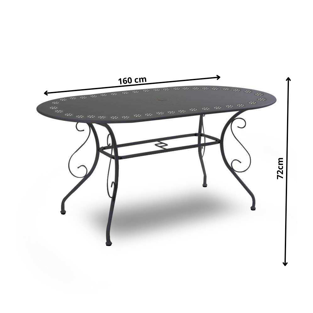 Kjo tavolinë metalike ovale është një zgjedhje perfekte për ata që duan të kombinojnë prakticitetin dhe stilin. Me kornizën e tij të fortë dhe këmbët elegante e të lakuara , ai ofron një pikë takimi ideale për momente të këndshme jashtë.